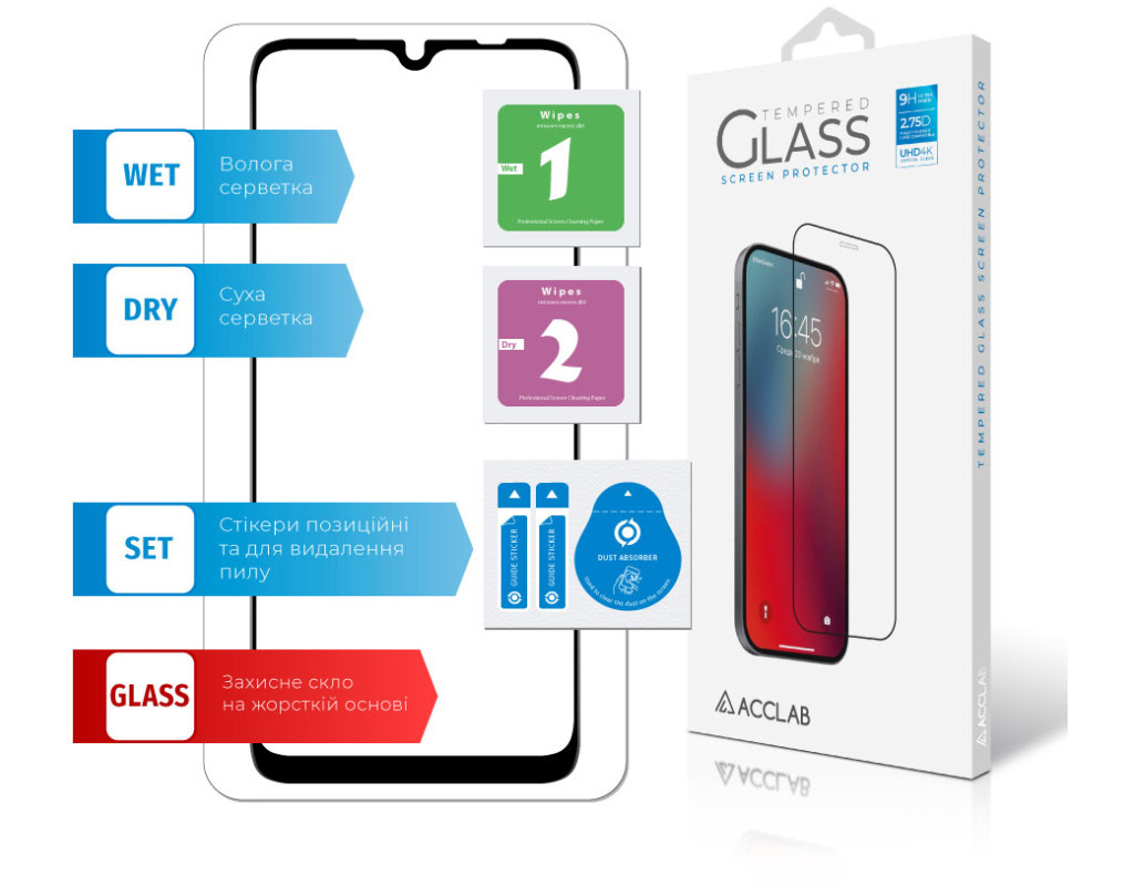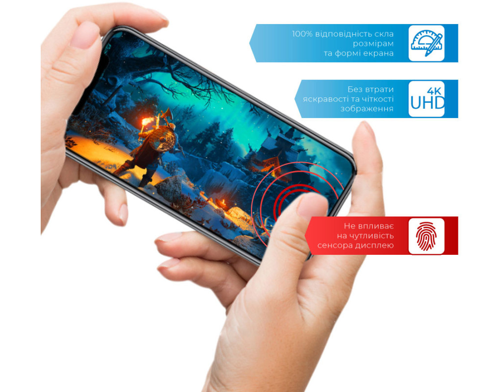 Захисне загартоване скло — один із найкращих засобів захисту не тільки екрана, але й усієї передньої панелі мобільного пристрою, від краю до краю. Воно повністю повторює розміри та форму передньої панелі смартфонів навіть із закругленими краями. Краї скла повторюють колір передньої панелі, тому скло майже невидиме для ока. Скло надійно оберігає від ударів або падінь. Ключові особливості: