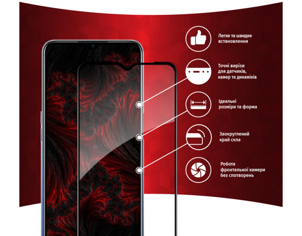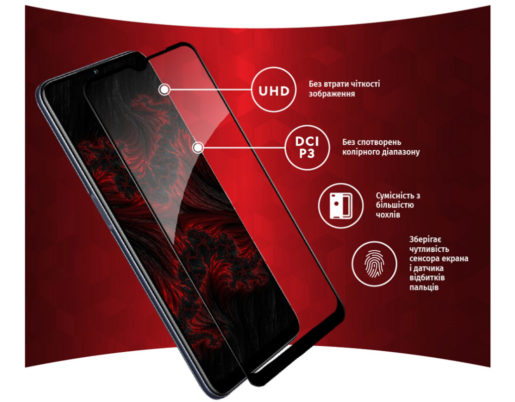 • Рівень міцності: 9H. Мінімізує ризик пошкодження передньої панелі мобільного пристрою під час повсякденного використання.