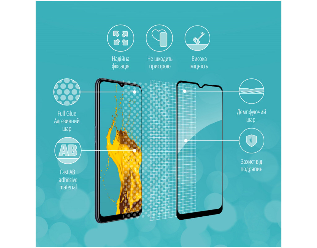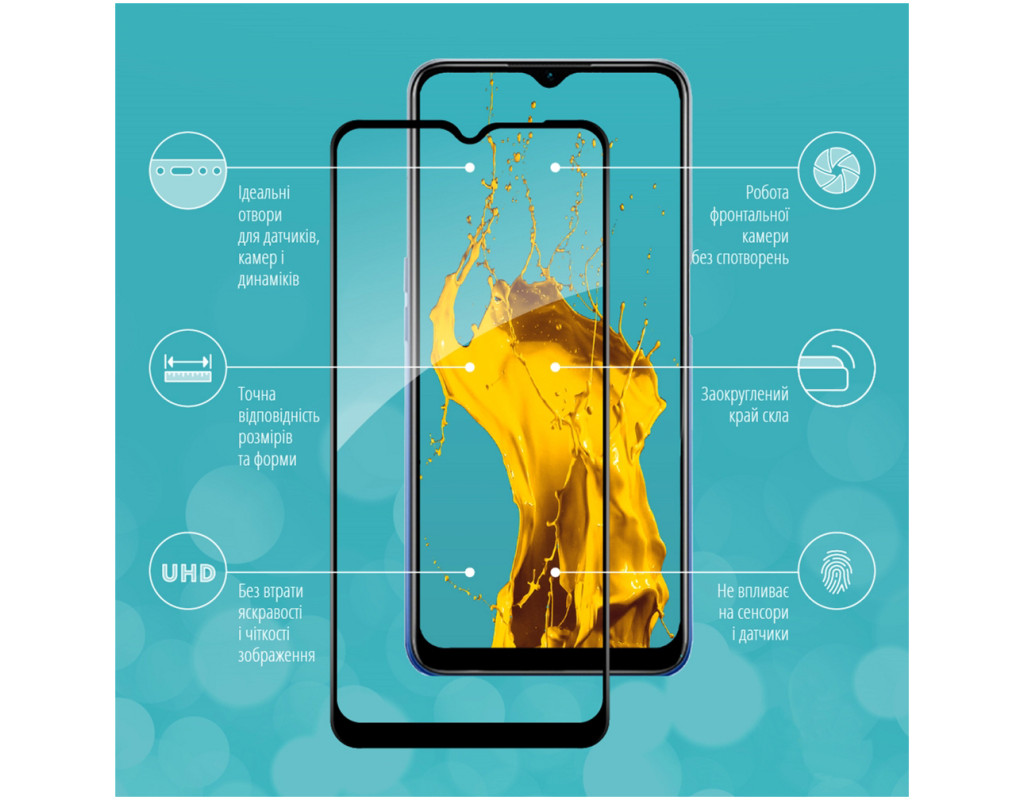 - Рівень міцності: 9H. Мінімізує ризик пошкодження передньої панелі мобільного пристрою під час повсякденного використання.