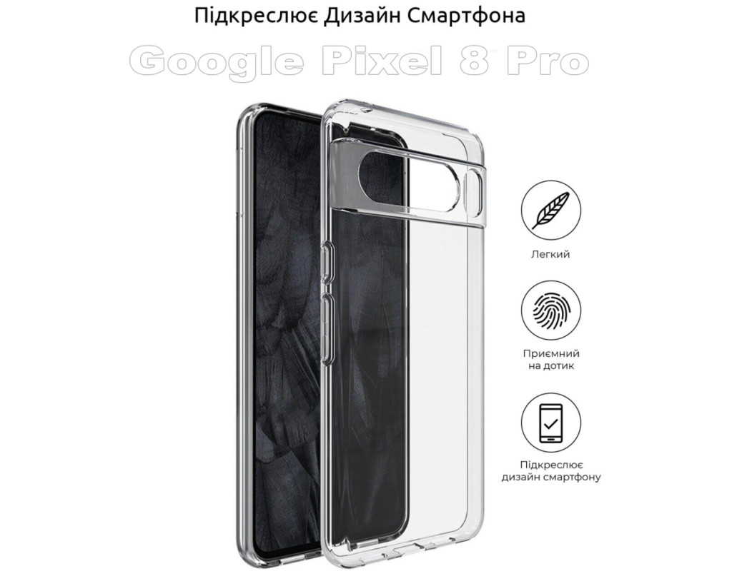 сумісність з моделями - Google Pixel 8 Pro, Тип чохла для телефону - накладка, Призначення - модельний, Матеріал - силікон, Колір - прозорий