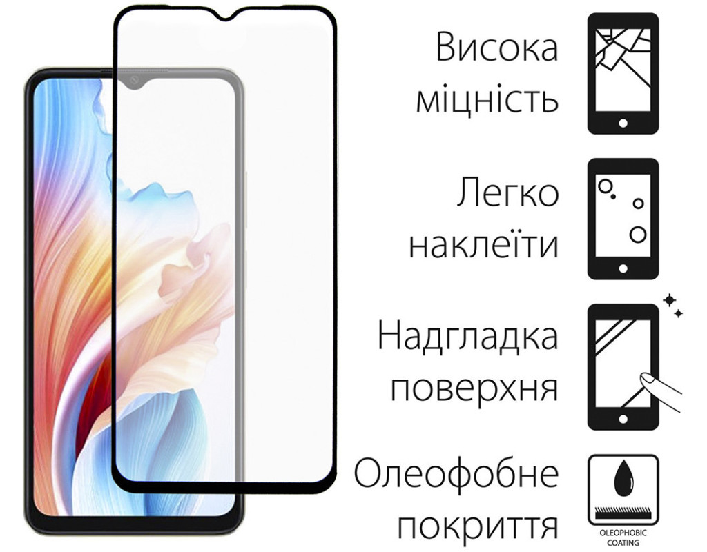 Призначення - для телефону, Вид покриття - захисний, Сумісність з моделями - Oppo A18, Спосіб наклеювання - на клейкій основі, Кількість в упаковці - 1 шт
