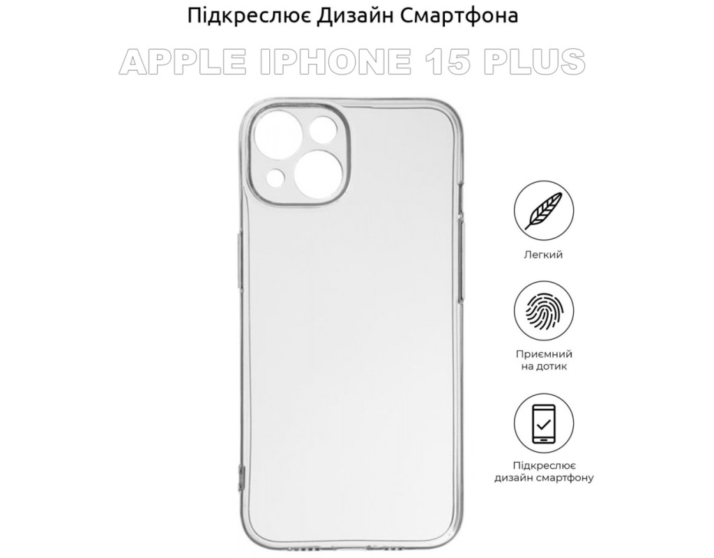 сумісність з моделями - Apple iPhone 15 Plus, Тип чохла для телефону - накладка, Призначення - модельний, Колір - прозорий