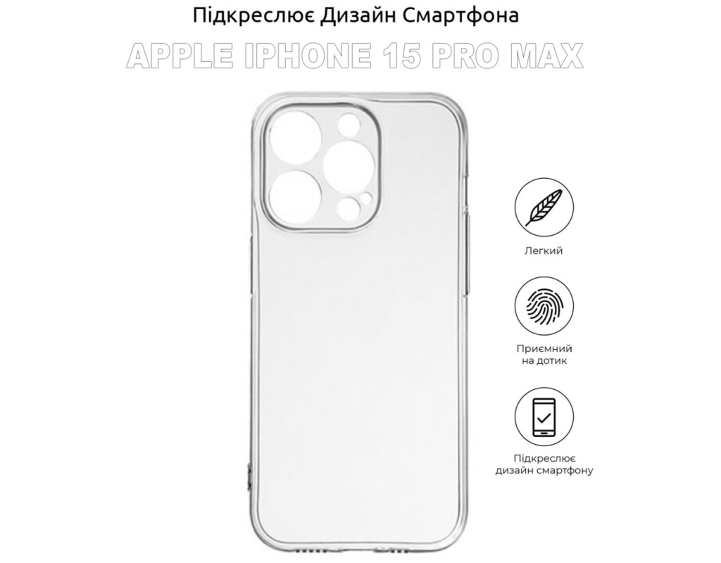 сумісність з моделями - Apple iPhone 15 Pro Max, Тип чохла для телефону - накладка, Призначення - модельний, Колір - прозорий