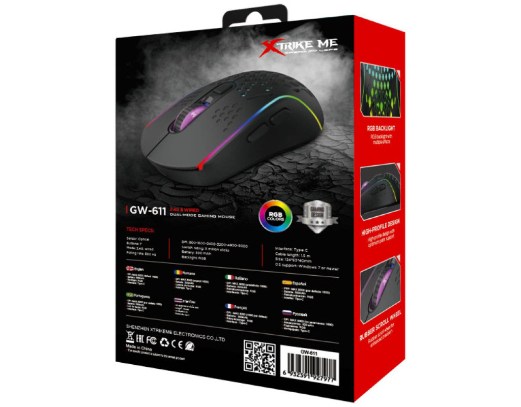 | Ігрова мишка Xtrike ME GW-611 Wireless RGB Black (GW-611) – це ваш надійний партнер у світі цифрових баталій. Створена для ентузіастів, які прагнуть поєднати комфорт і швидкість, ця мишка втілює в собі все, що необхідно для якісної гри. Завдяки ергономічному дизайну, вона легко підлаштовується під форму вашої долоні, забезпечуючи максимально комфортне позиціонування. В основі XTRIKE ME GW-611 лежить високоякісний оптичний датчик з максимальною роздільною здатністю 8000 dpi, що гарантує високу точність відстеження рухів і миттєву реакцію. Це дозволяє гравцям підлаштовувати чутливість мишки під свій індивідуальний стиль гри, будь то швидкісні шутери, складні стратегії чи ретельне полювання в World of Tanks. Підключення мишки відбувається бездротово через USB адаптер 2.4 ГГц, що забезпечує стабільний зв'язок без затримок і зайвих проводів. Акумуляторний механізм живлення дозволяє заряду триматися довго, звільняючи вас від постійної зміни батарей та надаючи свободу руху. Оригінальний перфорований корпус не лише додає стильності, але й знижує вагу миші, що надзвичайно важливо під час швидкоплинних ігор. Стильна RGB підсвітка збагачує зовнішність пристрою, переходячи з одного кольору в інший, створюючи дійсно яскраву атмосферу в процесі гри. Сім інтуїтивно розташованих кнопок дозволять швидко налаштувати мишку під ваші особисті потреби. Завдяки цьому, ви з легкістю зможете виконувати складні команди, що робить цю мишку ідеальним вибором для тих, хто цінує ефективність і функціональність. <б>Розміриб> 124 х 63 х 40 мм оптимальні для будь-якої руки, а стильний чорний колір доповнить будь-який інтер'єр. Xtrike ME GW-611 – це не просто мишка, це витвір інженерного мистецтва, який забезпечує якість і функціональність на найвищому рівні. Дайте волю вашій ігровій уяві з цим чудовим пристроєм, здатним перенести ваші ігрові досвіди на новий рівень! |
