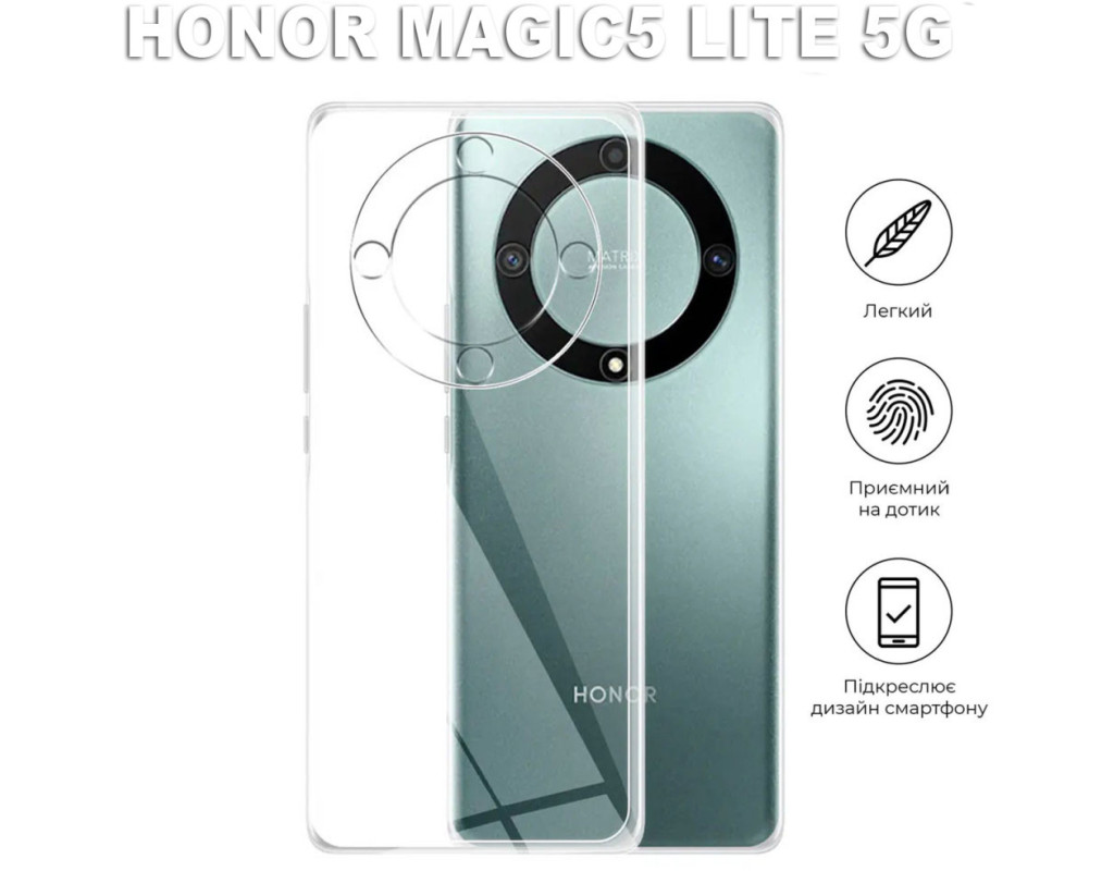 сумісність з моделями - Honor Magic5 Lite, Тип чохла для телефону - накладка, Призначення - модельний, Матеріал - силікон, Колір - прозорий
