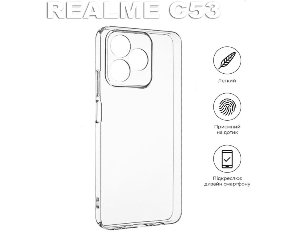 сумісність з моделями - Realme C53, Тип чохла для телефону - накладка, Призначення - модельний, Матеріал - силікон, Колір - прозорий