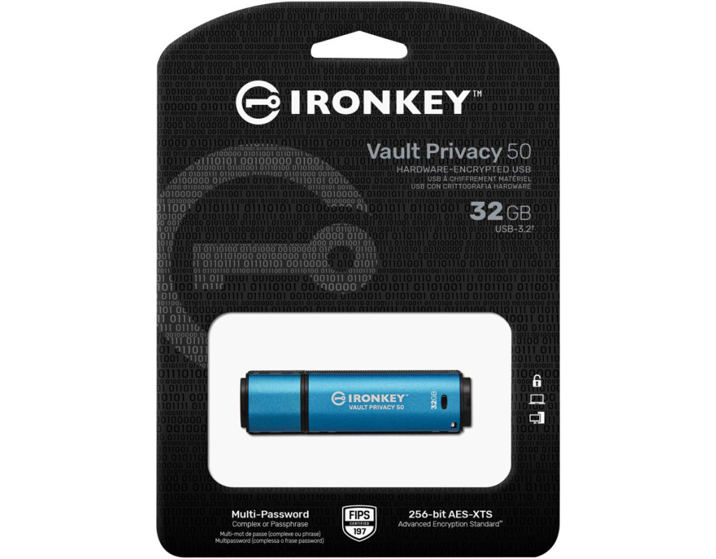 Kingston IronKey Vault Privacy 50 - це накопичувачі преміум-класу з інтерфейсами USB Type-A, що забезпечують безпеку корпоративного рівня завдяки 256-бітовій апаратній шифровці AES, сертифікованій за стандартом FIPS 197, у режимі XTS, включно з захистом від BadUSB з цифровим підписом, прошивкою та захистом від перебору паролів. VP50 пройшов тест на проникнення (випробування на проникнення) для забезпечення безпеки корпоративного рівня. Оскільки він забезпечує зашифроване сховище під фізичним контролем користувача, серія VP50 перевершує використання Інтернету та хмарних сервісів для захисту даних.