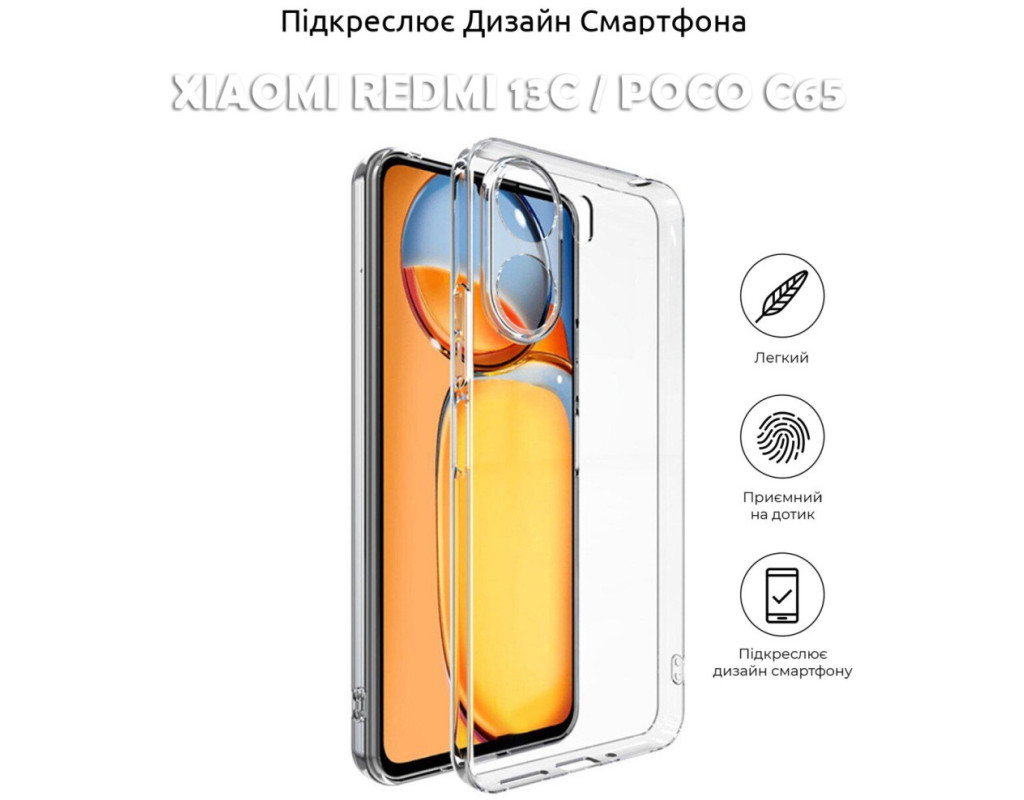 сумісність з моделями - Xiaomi Redmi 13C, Xiaomi Poco C65, Тип чохла для телефону - накладка, Призначення - модельний, Колір - прозорий