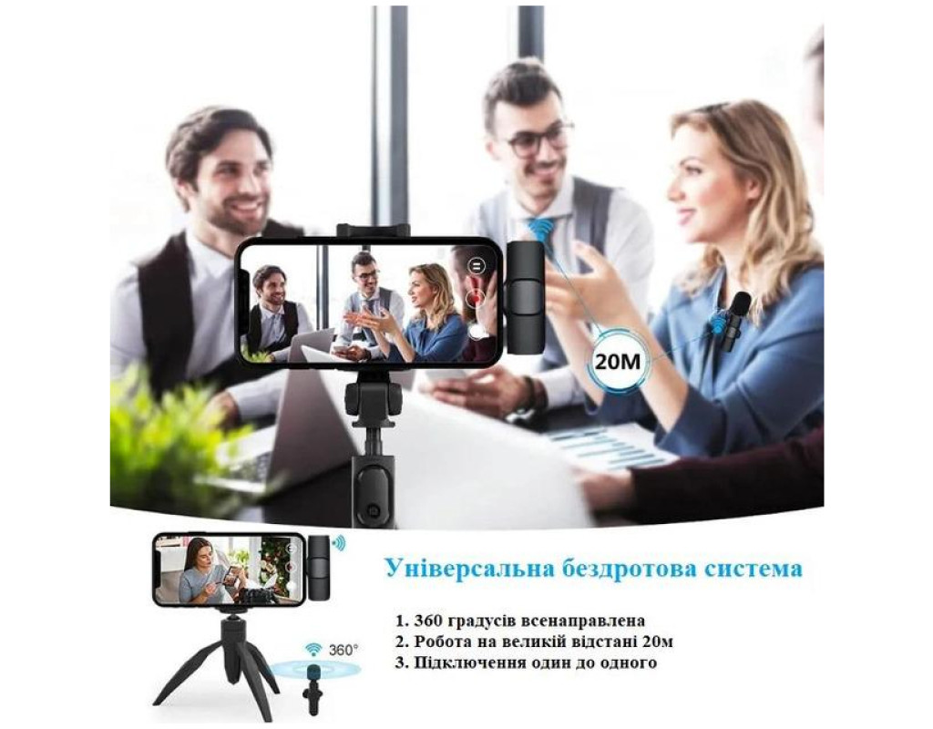 - Дана система радіо мікрофона складається з приймача (ресивера), що підключається до смартфону і мікрофона петлички з передавачем, що закріплюється на одязі. Дальність зв'язку по радіоканалу становить до 20 метрів при прямій видимості, тому ви зможете використовувати цей радіомікрофон як у приміщенні, так і на вулиці; Щоб розпочати запис, його достатньо підключити до телефону;