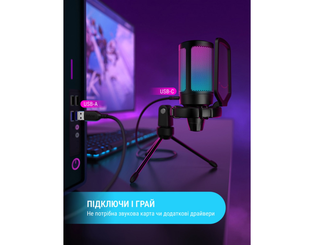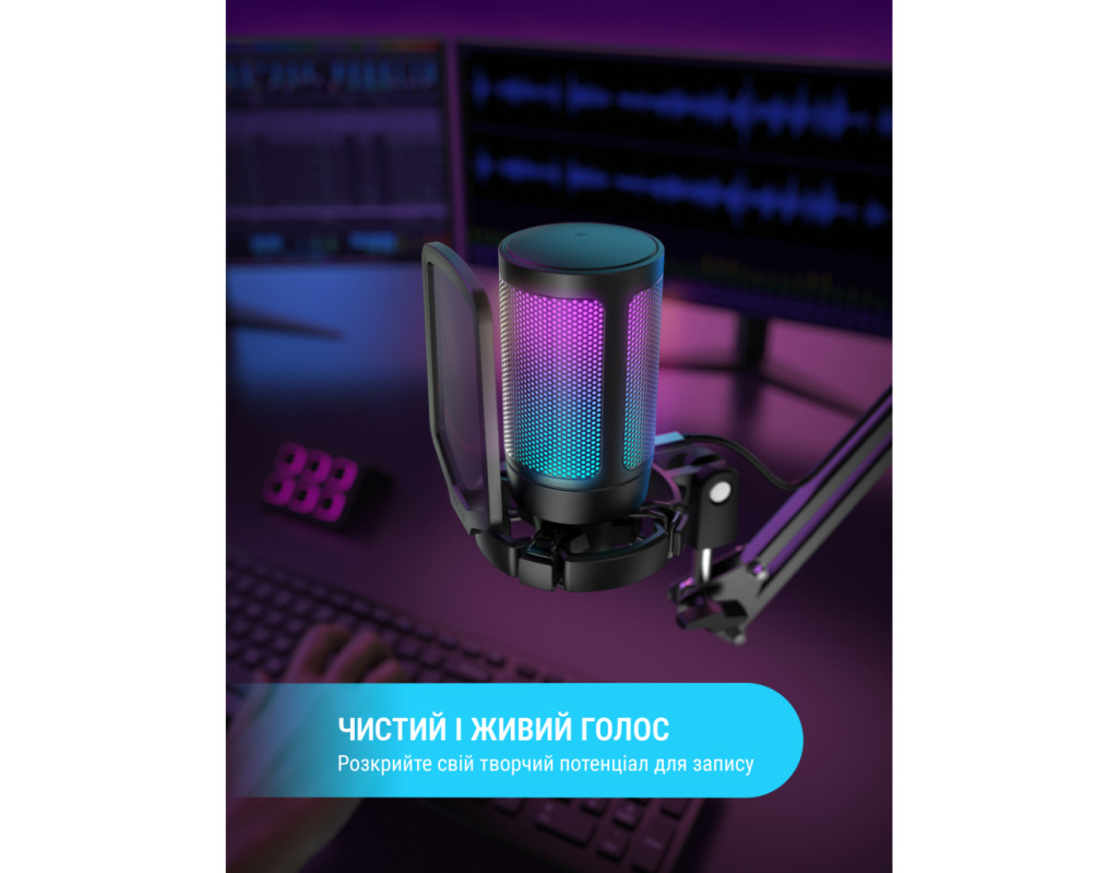 | Говоріть, і вас буде почуто Студійний USB мікрофон Fifine A6V AMPLIGAME надасть вам можливість заявити про себе на повний голос і досягти нових висот у сфері живих трансляцій і мовлення. Висока чутливість пристрою забезпечує якісну передачу голосу. А яскраве RGB-підсвічування додасть вашому стрімінгу потрібного настрою. Завдяки підтримці USB ви легко зможете під'єднати мікрофон до комп'ютера. Висока якість записуUSB мікрофон Fifine A6V AMPLIGAME призначено для запису та передавання кришталево чистого звуку. Цей мікрофон має високу чутливість до будь-яких відтінків голосу, він вловлює і чітко передає будь-які зміни інтонації, а також зменшує фонові шуми, щоб підвищити якість звуку вашої трансляції. Додайте в трансляцію яскравих фарбЗа допомогою RGB-підсвічування ви зможете швидко визначити, що мікрофон готовий до роботи: після увімкнення він почне світитися. Під час стріму підсвічування допоможе створити потрібний настрій, а знімний поп-фільтр із веселим смайликом не тільки мінімізує зовнішні шуми, а й змушує зайвий раз посміхнутися. Універсальна сумісність і комфортЦей мікрофон plug-and-play сумісний з ПК, PS4, PS5 і MAC, тому для початку трансляції потрібно просто підключити його за допомогою USB-роз'єму. Завдяки стійкій регульованій тринозі ви зможете встановити мікрофон у найзручнішому положенні, а довгий кабель дає змогу без проблем переміщати його на робочому столі. Регулятор гучності в нижній частині дає можливість легко керувати звуком. |