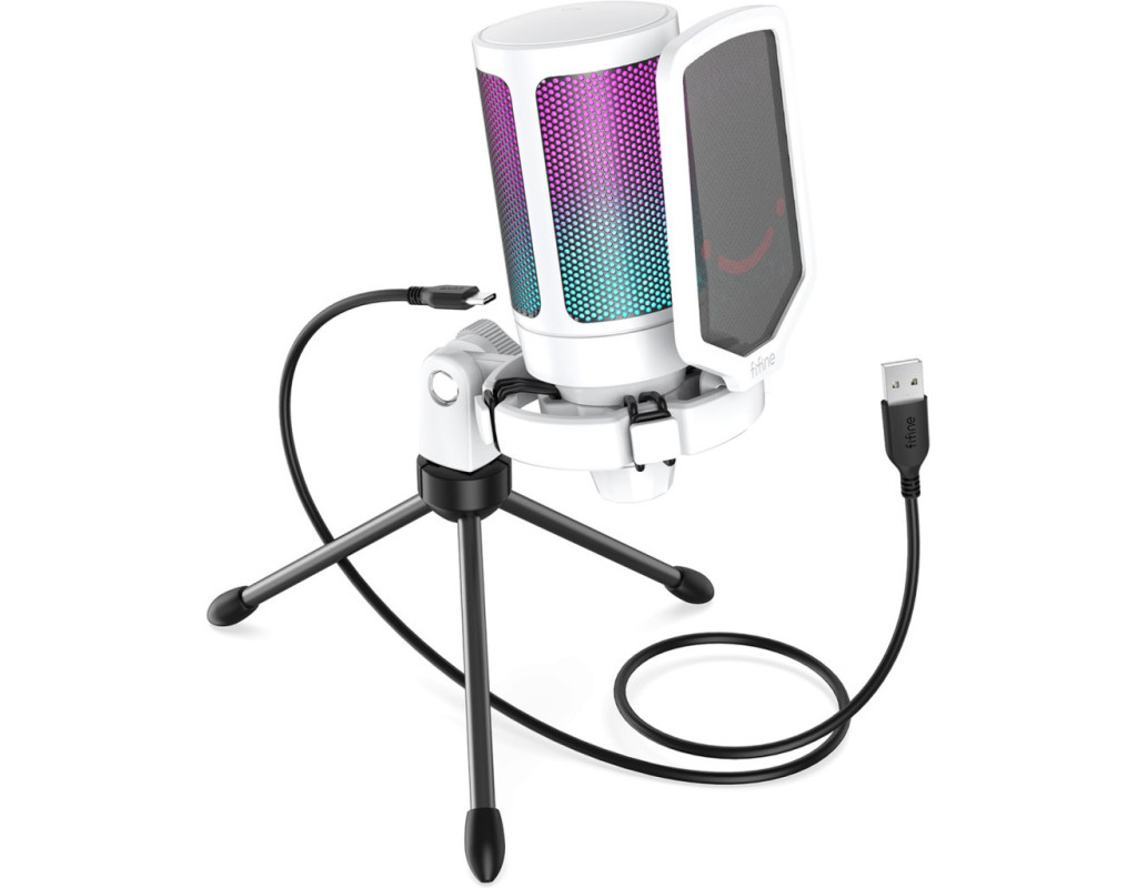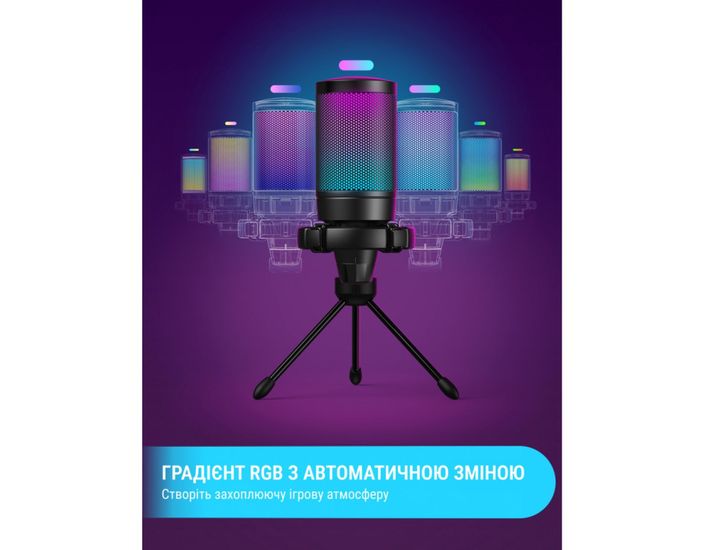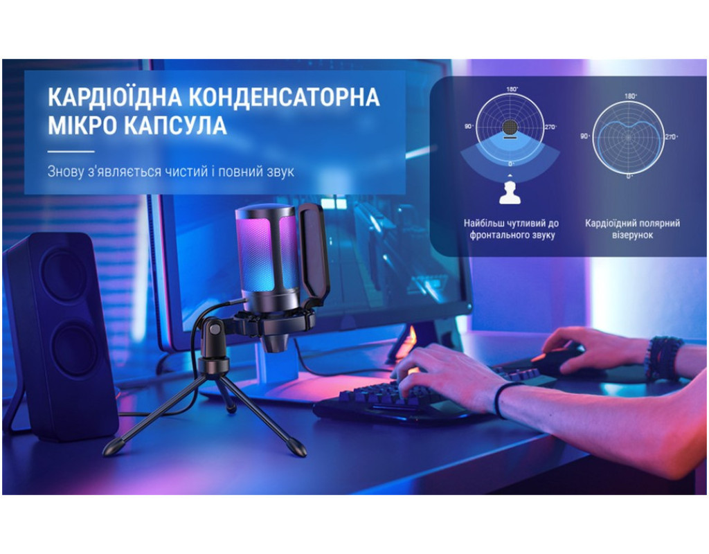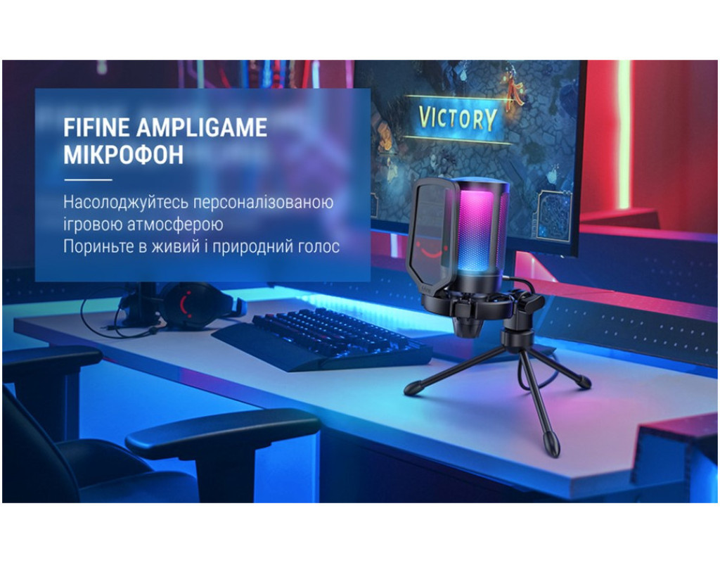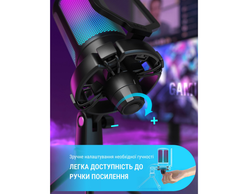 | Fifine AmpliGame – якісний ігровий мікрофон з усіма необхідними аксесуарами, стане справжнім подарунком для досвідченого геймера. Якісний звук із глибокими низькими та чистими високими частотами, зручна тринога, вражаюче RGB-підсвічування, знімний поп-фільтр. Мікрофон працює на консолі Windows, Mac та PlayStation. USB порт розташований прямо за мікрофоном, що робить підключення зручнішим. |