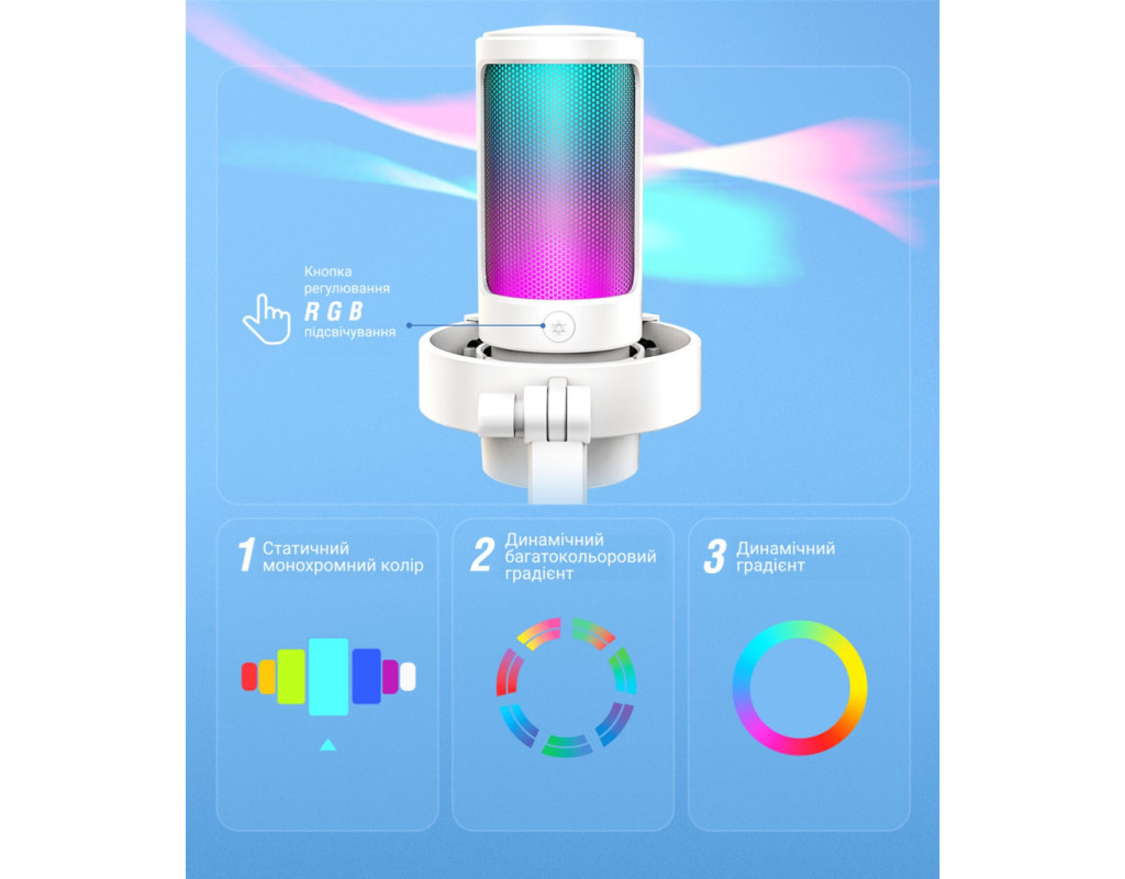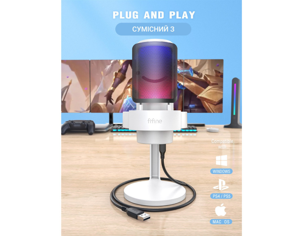 | Fifine AmpliGame – якісний ігровий мікрофон з усіма необхідними аксесуарами, стане справжнім подарунком для досвідченого геймера. Якісний звук із глибокими низькими та чистими високими частотами, зручна тринога, вражаюче RGB-підсвічування, знімний поп-фільтр. Мікрофон працює на консолі Windows, Mac та PlayStation. USB порт розташований прямо за мікрофоном, що робить підключення зручнішим. |