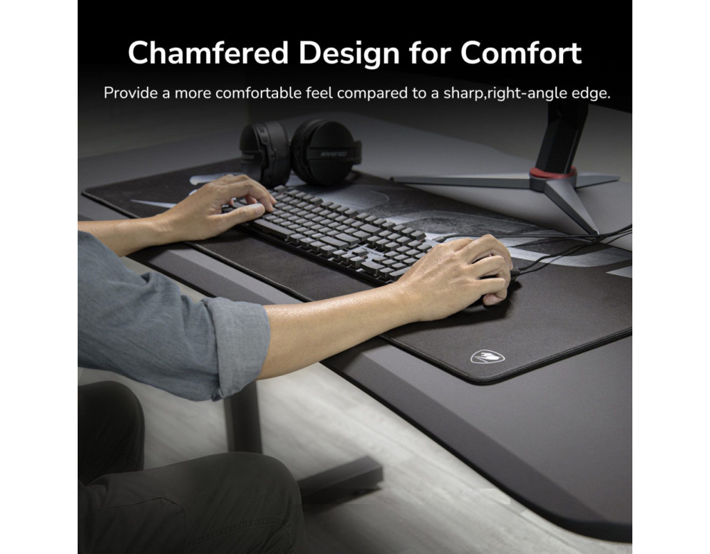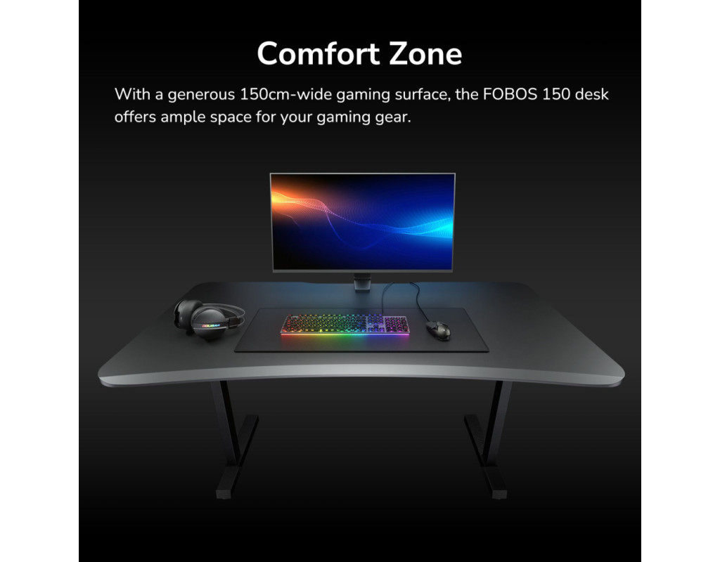 Зона комфорту Завдяки великій ігровій поверхні шириною 150 см, стіл Cougar Fobos 150 пропонує достатньо місця для ігрових моніторів, клавіатур та іншого необхідного обладнання. Продумані конструктивні особливості, такі як вигнуті краї та закруглені кути, підвищують комфорт та ергономічність ігрового проведення часу.
