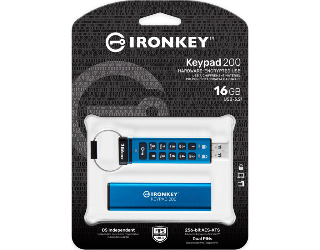 Kingston IronKey Keypad 200 - це USB-накопичувачі Type-A і Type-C з апаратним шифруванням, оснащені буквено-цифровою клавіатурою для зручного доступу за допомогою PIN-коду, які не залежать від ОС. Особливості:
