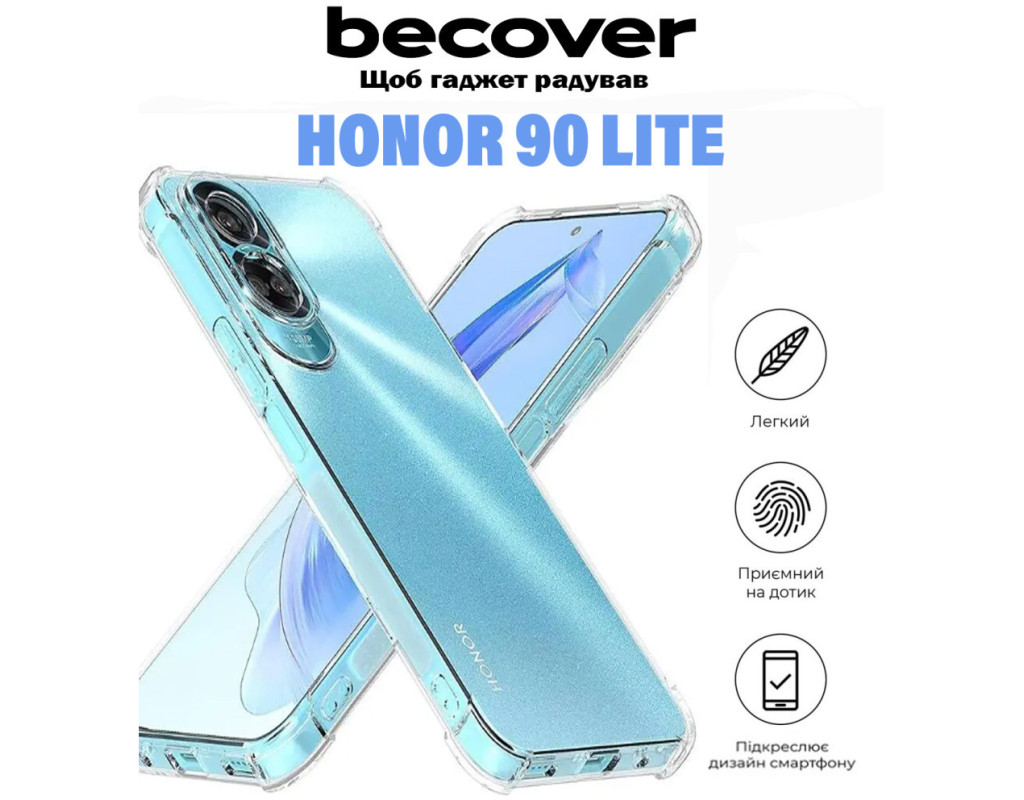 сумісність з моделями - Honor 90 Lite, Тип чохла для телефону - накладка, Призначення - модельний, Колір - прозорий