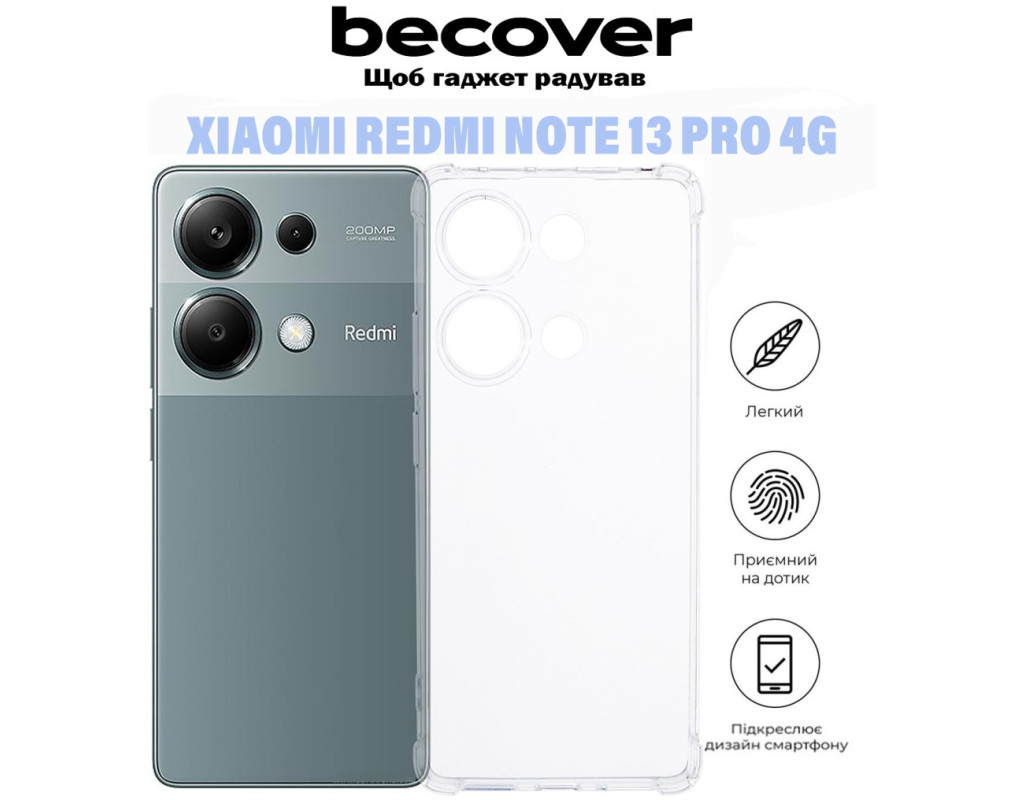 сумісність з моделями - Xiaomi Redmi Note 13 Pro, Тип чохла для телефону - накладка, Призначення - модельний, Матеріал - силікон, Колір - прозорий