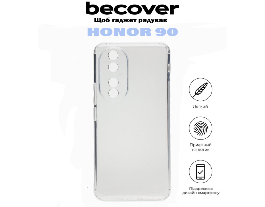 сумісність з моделями - Honor 90, Тип чохла для телефону - накладка, Призначення - модельний, Матеріал - силікон, Колір - прозорий