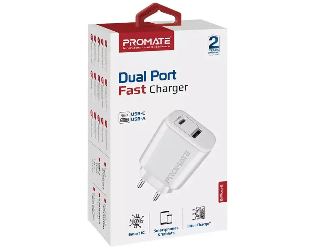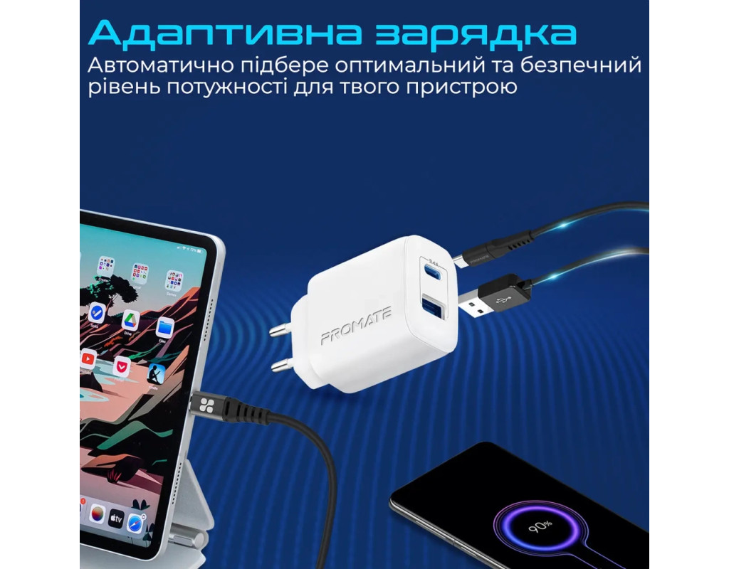 | Зарядний пристрій Promate 17W USB-C + USB-A (biplug-2.white) – це ідеальний вибір для тих, хто цінує якість та універсальність у мобільних аксесуарах. Цей адаптер, підключаючись до мережі, покриває всі ваші потреби у заряджанні, будь то смартфони, екшн-камери, геймпади, смарт-годинники або TWS навушники. Його потужність в 17 Вт гарантує швидке та ефективне відновлення енергії пристроїв. Promate BiPlug-2 підтримує одночасне заряджання двох пристроїв завдяки портам USB Type-C та USB-A. Інтелектуальний порт InteliCharge 2.4А USB-А автоматично обирає оптимальний рівень струму, що забезпечує безпеку та довговічність ваших гаджетів. Оснащений Smart IC чіпом, він захищає від перегрівання та стрибків напруги, забезпечуючи стабільність та надійність роботи. Цей адаптер вирізняється компактним дизайном (25x35x50 мм), що робить його ідеальним для використання у будь-яких умовах без зайняття зайвого простору. Виготовлений з вогнетривкого ABS-пластику, він забезпечує не лише функціональність, а й значний рівень безпеки при тривалому користуванні. Обравши Promate BiPlug-2, ви отримуєте надійного партнера для щоденного використання. |