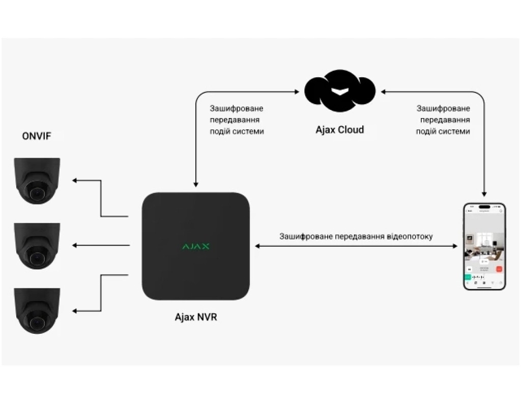 | Мережевий відеореєстратор Ajax NVR забезпечує інтеграцію сторонніх камер в систему Ajax без зайвих турбот. Він гарантує повну синхронізацію камери з охоронними пристроями. Навігація є зручною: всі події реєструються в журналі і позначаються на часовій шкалі відеоархіву. Ви можете налаштувати сценарій, і камери автоматично розпочнуть запис при спрацюванні датчиків. Ключові характеристики цього пристрою включають: • Підтримку одночасного обслуговування 8 або 16 каналів відеопотоку з роздільною здатністю до 4K. • Можливість використання накопичувача об'ємом до 16 ТБ. • Наявність програмного розпізнавача руху, який постійно аналізує зображення, з можливістю налаштування зони виявлення в застосунках Ajax. • Перехід від події в журналі до відеозапису цієї події в архіві із великою легкістю. • Відображення візуальних даних системи в застосунку Ajax, включаючи дані від датчиків MotionCam. • Можливість створення сценарію, в якому датчики Ajax активують обрані камери та запускають запис відео для швидкої візуальної верифікації, яку можна переглянути на смартфоні або ПК через відповідний додаток. Інтерфейс Ajax NVR є зручним для перемикання між відеопотоками, а відеоархів завантажується миттєво, з максимально плавною навігацією по часовій шкалі. Може працювати з камерами за допомогою ідентифікації в DHCP-мережі, і додаткові налаштування локальної мережі не потрібні. Підключення і налаштування легко виконуються через захищений сервер Ajax Cloud, як на місці, так і віддалено. Ви можете спостерігати за камерами в режимі реального часу через мобільний додаток або створити свою власну станцію моніторингу у застосунку Ajax PRO Desktop. Захист облікового запису має високий пріоритет, і він забезпечується за допомогою різних методів, таких як пароль, біометрія, двофакторна автентифікація та контроль сесій. Користувачі можуть контролювати доступ до окремих відеопотоків і фотографій в режимі реального часу завдяки меню "Конфіденційність". Архів також має комплексний захист, включаючи унікальний патерн запису візуальних даних та фізичне відстеження підключення накопичувача. Додаток Ajax реєструє всі події підключення або відключення та надсилає сповіщення у застосунки Ajax. Після встановлення системи не лишається слабких місць для несанкціонованого доступу завдяки тимчасовим доступам для PRO-акаунтів та ролі адміністратора системи. Доступ до відеопотоку в системі Ajax можливий лише за наявності дозволу адміністратора системи. Розширений опис мережевого відеореєстратора Ajax NVR: Версії продукту: • Ajax NVR (8 каналів) - Мережевий відеореєстратор на 8 каналів • Ajax NVR (16 каналів) - Мережевий відеореєстратор на 16 каналів Інноваційна інтеграція захисту у відеоспостереження Ajax NVR – це результат співпраці відеоспостереження і системи Ajax. Почуйте виразну відмінність системи, яка забезпечує миттєвий доступ до відеоархіву навіть у русі. Широкі можливості сумісності дозволяють інтегрувати практично будь-яку IP-камеру в систему безпеки та автоматизації. Ajax NVR успадкував переваги професійної системи безпеки, які довіряють мільйони користувачів по всьому світу. Ключові функції: 1. Миттєва верифікація тривог у високій роздільній здатності: Забезпечує підтримку найвищої роздільної здатності для миттєвої перевірки тривог. 2. Підтримка ONVIF/RTSP: Можливість використовувати ONVIF/RTSP дл