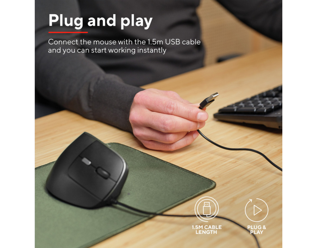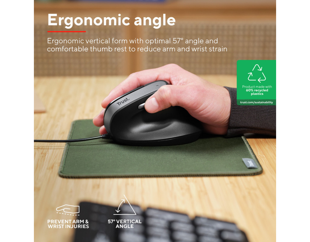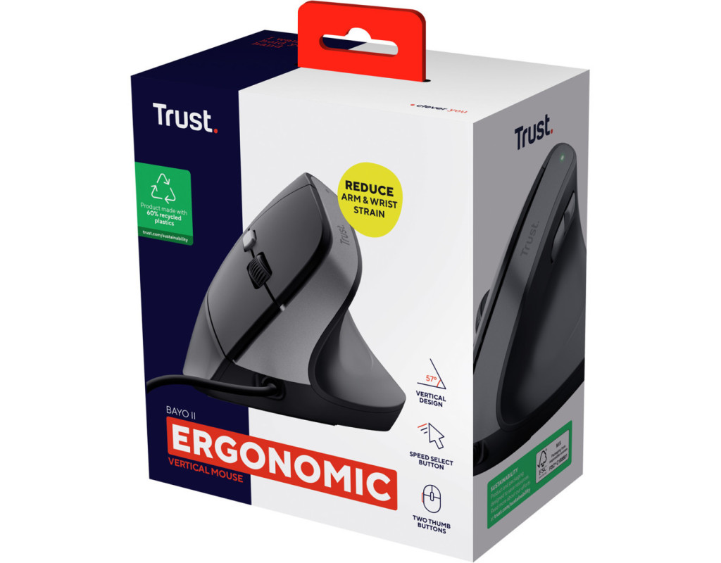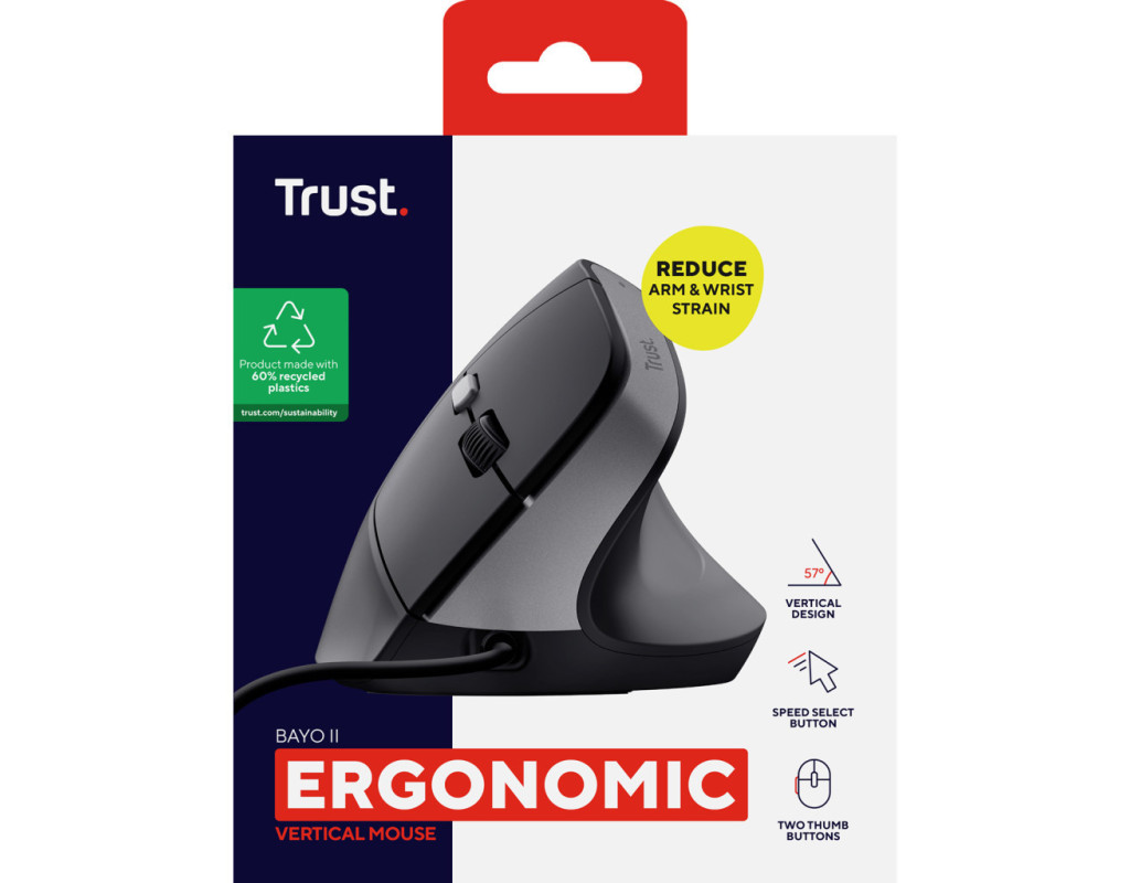 | Trust Bayo II Ergonomic USB Black (25144) — це поєднання інноваційного дизайну та високої якості, створене для максимального комфорту та продуктивності під час роботи з комп'ютером. Ця вертикальна мишка швидко стане незамінним аксесуаром у вашому арсеналі завдяки своїм численним перевагам. Перш за все, Bayo II вигідно вирізняється своїм ергономічним дизайном. Кут нахилу в 57 градусів забезпечує природне і розслаблене положення руки та зап'ястя, що значно знижує напругу під час тривалої роботи. Завдяки цьому ви зможете працювати довше без відчуття дискомфорту чи втоми. Ця миша зроблена з турботою про ваше здоров’я і комфорт. Шість кнопок на мишці, включаючи легко доступні бічні кнопки для великого пальця, дозволяють з легкістю переміщуватися вперед і назад по сторінках. Це робить роботу з великим обсягом інформації значно ефективнішою. Кнопка для зміни швидкості миші дозволяє зручно перемикати роздільну здатність від 800 до 2400 dpi, що гарантує високу точність у виконанні різних завдань — від роботи з графікою до бездоганного перегляду вебсторінок. Якість Trust Bayo II підтверджена надійною дротовою конструкцією з підключенням через USB, що дозволяє уникнути переривань у роботі. 1.5-метровий кабель забезпечує достатню свободу рухів, не турбуючи про втрату сигналу, що часто зустрічається у бездротових моделях. Особливу увагу приділено екофункційності: ця миша виготовлена на 60 % з переробленого пластику, що робить її вибором для тих, хто піклується про навколишнє середовище. Завдяки цьому, Bayo II не лише турбується про ваше здоров’я, але й про стан нашої планети. Легкість і компактність — ще одні з переваг цієї миші. З розмірами 120 х 77 х 73 мм і вагою 121 г, вона зручна для транспортування і не займе багато місця на вашому робочому столі. Її універсальний чорний колір легко поєднається з будь-яким стилем вашого офісу чи домашнього інтер’єру. Trust Bayo II Ergonomic USB Black — це не просто комп'ютерний аксесуар, а повноцінний інструмент, що підвищить вашу продуктивність і зробить робочий процес не тільки ефективним, а й максимально зручним. З довговічністю у кожній деталі, ця мишка стане вашим незамінним помічником на довгі роки. Оберіть Bayo II для досягнення нових вершин комфорту і продуктивності. |