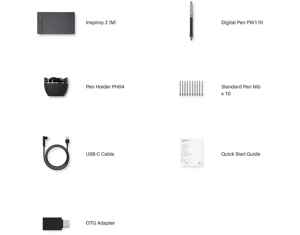 PenTech 3.0 подарує вам всебічну насолоду Inspiroy 2 поставляється з пером PW110 без батарейок, яке тонше, ніж PW517. Перо збільшує довжину силіконового захоплення і втоплює дві програмовані кнопки пера для запобігання випадкового натискання. Всі ці удосконалення підвищують зручність під час використання. Ви, як і раніше, можете насолоджуватися функцією підтримки нахилу, стабільністю малювання завдяки коротшій відстані висування і 8192 рівням чутливості до натиску. У комплект поставки також входить ергономічний тримач для пера.