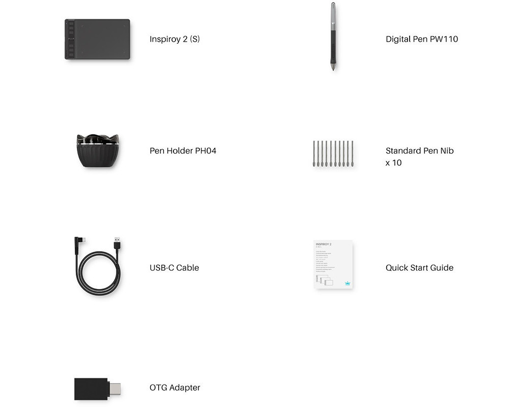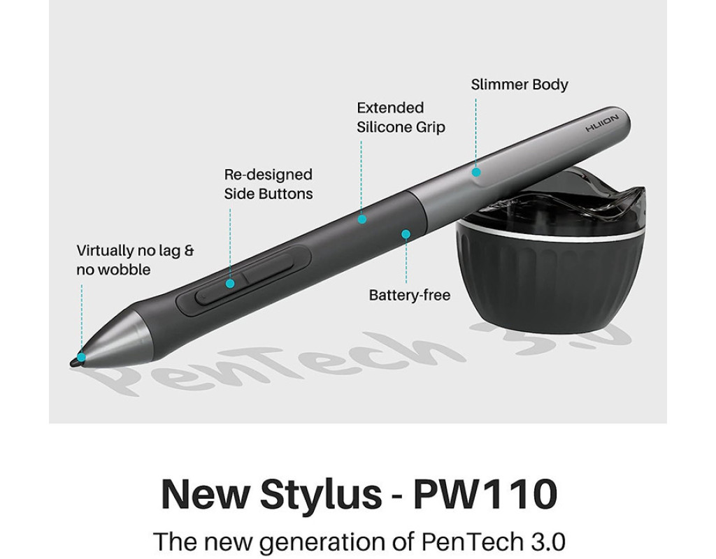 PenTech 3.0 подарує вам всебічну насолоду Inspiroy 2 поставляється з пером PW110 без батарейок, які тонші, ніж PW517. Перо збільшує довжину силіконового захоплення та втоплює дві програмовані кнопки пера для запобігання випадковому натисканню. Всі ці вдосконалення підвищують зручність використання. Ви, як і раніше, можете насолоджуватися стабільністю малювання завдяки коротшій відстані висування та 8192 рівням чутливості до натиску. У комплект постачання також входить ергономічний утримувач для пера.