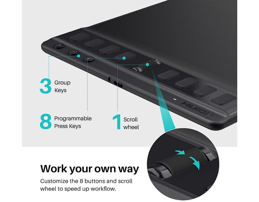 Простіша навігація, легше використовувати Завдяки висоті панелі (на 2 мм вище поверхні малювання), різниці в кольорі між клавішами та панеллю, а також горбкам на клавішах стало набагато легше орієнтуватися. Крім того, Inspiroy 2 включає дуже зручний скролер, чутливість якого можна регулювати в драйвері, подібно колесу прокручування миші.
