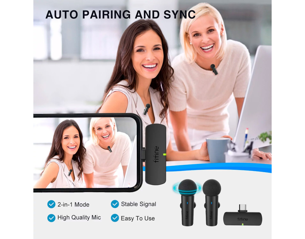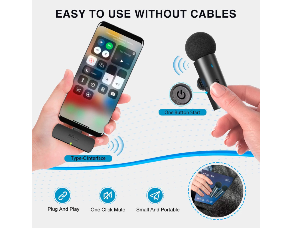 | Fififne M8 — універсальний петельний бездротовий мікрофон, сумісний із телефонами Android через USB Type-C порт і з iPhone через перехідник. Автономний час роботи до 6 годин без перерви. Пристрій чудово підходить для YouTube/Instagram/TikTok трансляцій, відеоконференцій або аудіозапису. Відстань для якісного передавання звуку досягає 20 м без бар’єра. Мікрофон Fifine M8 ефективно підвищує розбірливість, деталізацію і глибину голосу і водночас вловлює мінімум фонового шуму. Кнопка вимкнення звуку миттєво й безшумно вимикає мікрофон. Це позбавляє потреби переривати трансляцію або конференц-зв’язок.
