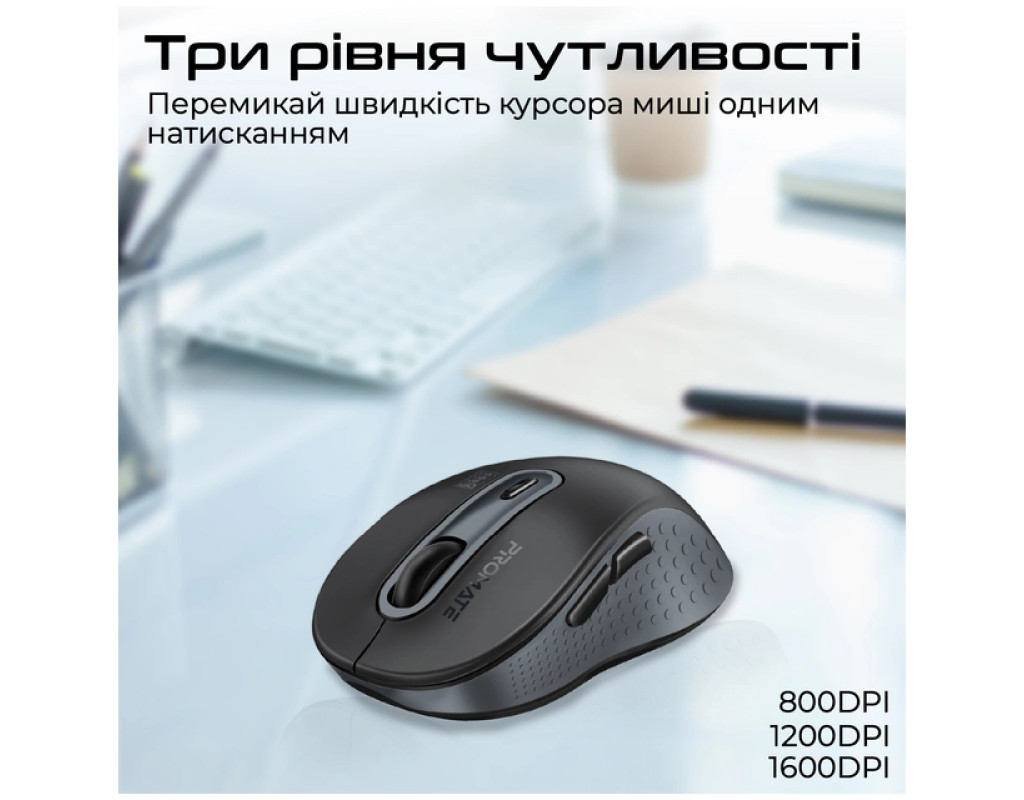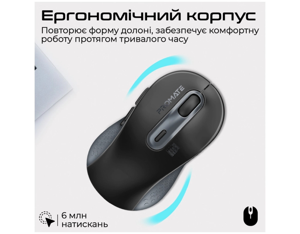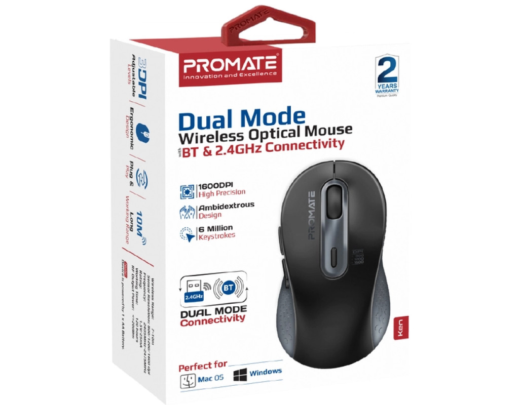| Promate Ken Wireless/Bluetooth Black — ваш надійний партнер для щоденних завдань і професійних потреб. Ця класична бездротова мишка з оптичним датчиком стане ідеальним вибором для ноутбука завдяки своїй компактності та багатофункціональності. Унікальна особливість Promate Ken — можливість подвійного з'єднання: використовуй з'єднання через Bluetooth або за допомогою USB-A приймача. Це забезпечує зручність і гнучкість у використанні, дозволяючи підключатися до будь-якого пристрою, будь то Android, iOS, Windows чи macOS. Мишка вирізняється ергорномічним дизайном, що повторює форму долоні, забезпечуючи комфорт протягом тривалого часу. Завдяки шістьом кнопкам, включаючи бічні кнопки для швидкої навігації по документах та веб-сторінках, ви отримаєте повний контроль у будь-якій ситуації. Користувачі оцінять три рівні чутливості (800/1200/1600 dpi), що дає змогу вибирати оптимальну швидкість курсора для різних завдань. Розмір миші становить 108 х 61 х 38 мм, а вага — лише 112 г, що робить її ідеальною для транспортування разом з ноутбуком. Особливу увагу варто звернути на енергоефективність: Promate Ken працює на одній батарейці типу AA й забезпечує до 150 годин безперебійної роботи. Завдяки цьому ви не залишитесь без зв'язку в найвідповідальніший момент. Параметри підключення забезпечують стабільність у радіусі до 10 метрів у діапазоні 2.4 GHz, що дозволяє працювати без завад і затримок. Тривалий термін служби, що становить до 6 мільйонів натискань, робить мишку довговічним інструментом. З таким надійним партнером, як Promate Ken Wireless/Bluetooth Black, ви почуватимете себе впевнено, виконуючи завдання будь-якої складності. Це не просто аксесуар, це інвестиція в якість і ефективність вашої роботи. |
