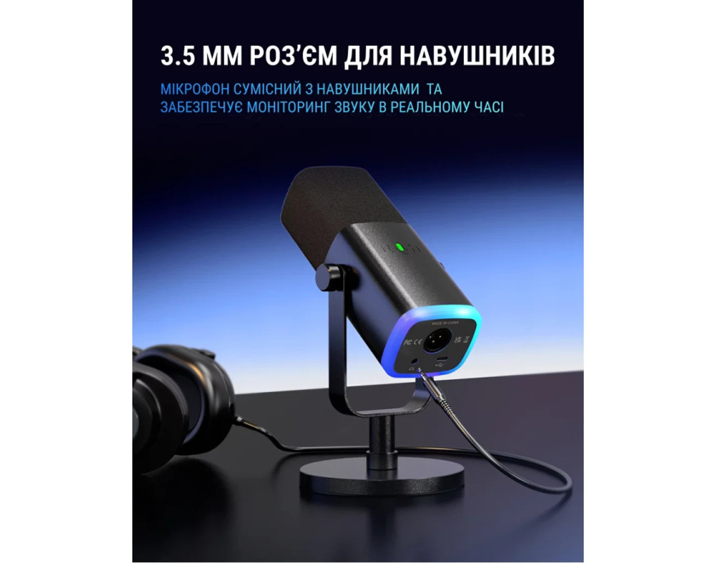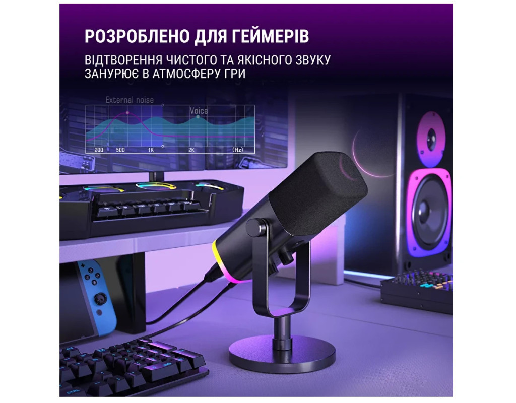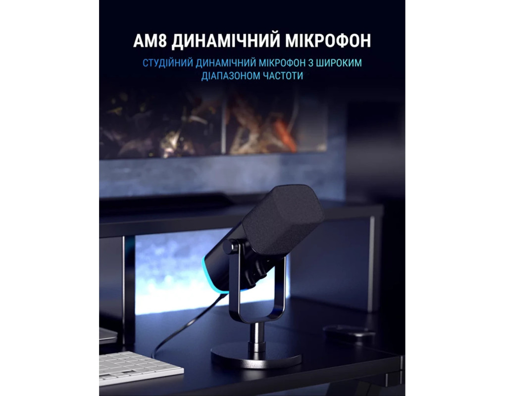 Fifine Ampligame AM8 представляє собою динамічний мікрофон з проводовим USB і XLR підключенням, який відмінно підійде для запису підкастів, стримів, озвучки, проведення трансляцій. Він має кардіоїдний капсуль, який забезпечує високу чіткість та деталізацію мови. У комплекті постачається стійка для зручного розміщення мікрофона на столі. Для моніторингу голосу в реальному часі є вихід на навушники. RGB-підсвічування на основі мікрофона дозволить створити унікальну атмосферу під час запису. |
