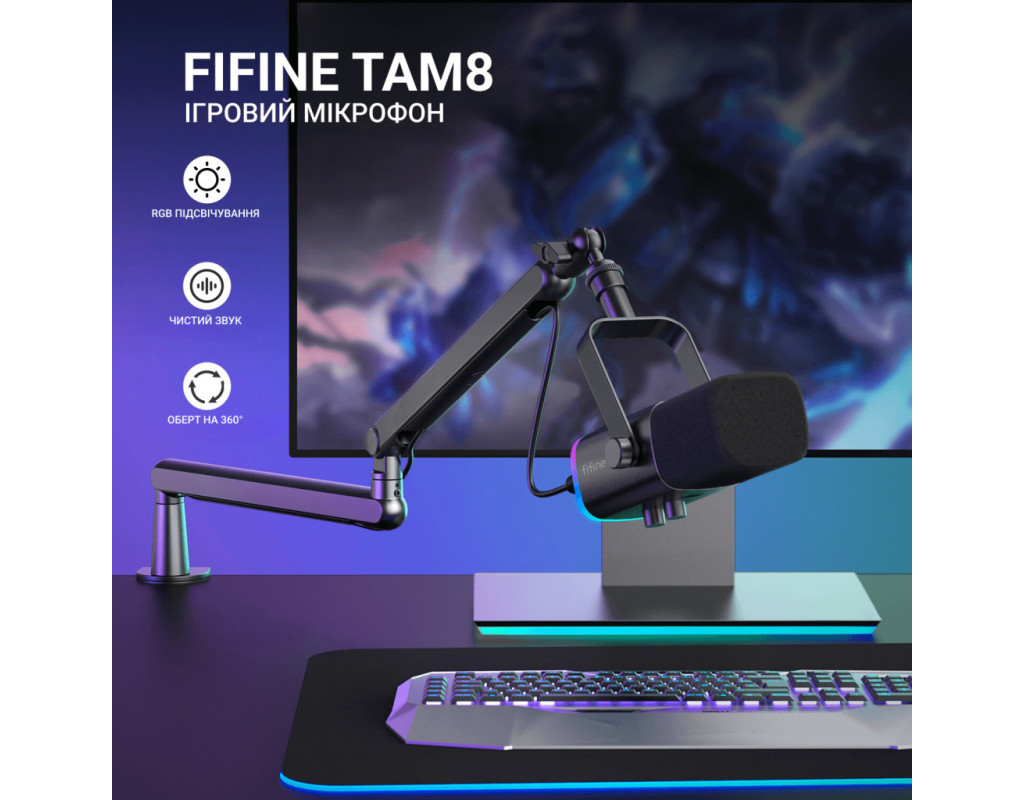 Динамічний мікрофон Fifine TAM8 з USB та XLR підключенням має здатність передавати ідеальний звук у неідеальних умовах і відмінно підійде для запису подкастів, стримів, озвучки, проведення трансляцій. Металевий пантограф з вбудованим сховищем для дротів є комфортним рішенням для організації вашого простору, а яскраве RGB підсвічування додасть атмосфери твоїй грі. ФункціональністьTAM8 відрізняється своєю універсальністю і здатністю передавати чіткий звук у різних умовах. Його кардіоїдний малюнок спрямованості забезпечує якісний звуковий запис, навіть у шумних середовищах. РегулюванняМікрофон оснащений кнопкою вимкнення мікрофона та кнопкою регулювання RGB підсвічування, що дозволяє вам налаштувати його відповідно до вашого настрою. Зручний роз'єм для навушників і двома регуляторами гучності, розташованими знизу мікрофона, забезпечує максимальний комфорт у користуванні. ПідключенняБлок живлення від USB та XLR забезпечує стабільний зв'язок і високоякісний звуковий сигнал. Роз'єм XLR дозволяє мінімізувати власний шум, забезпечуючи чистий звуковий запис. Оберіть мікрофон Fifine TAM8 і насолоджуйтеся якістю звуку та зручністю використання на новому рівні. TAM8 — ваш надійний помічник у світі аудіо звукозапису. |