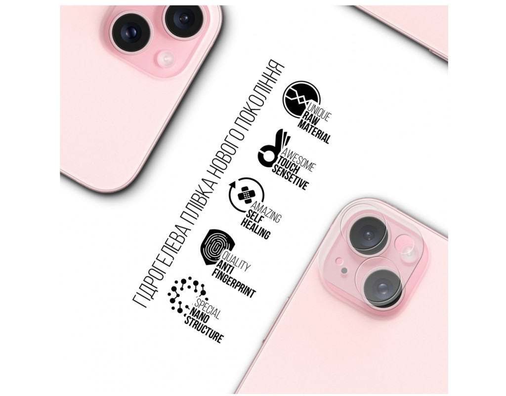 Призначення - для камери телефона, Вид покриття - захисний, гідрогелева, Сумісність з моделями - Apple iPhone 15 Plus, Кількість в упаковці - 6 шт