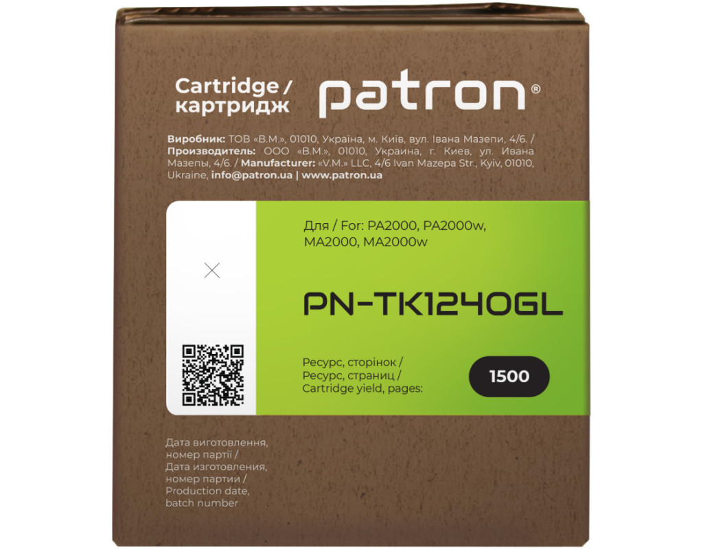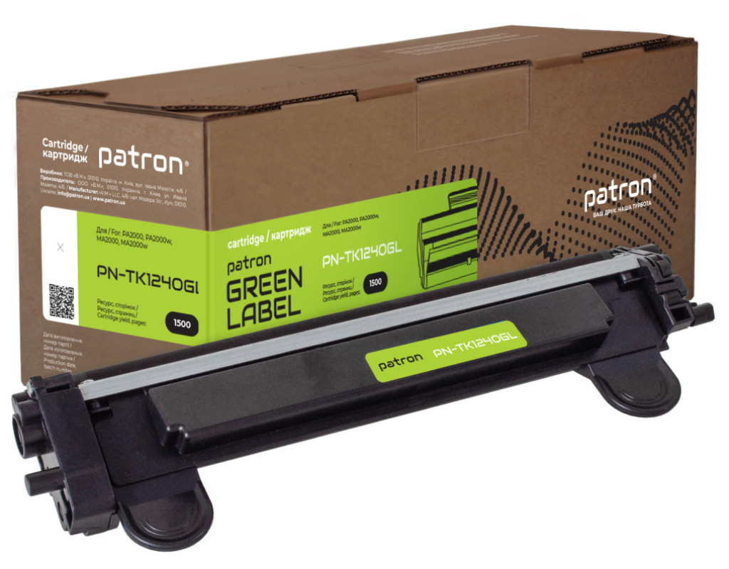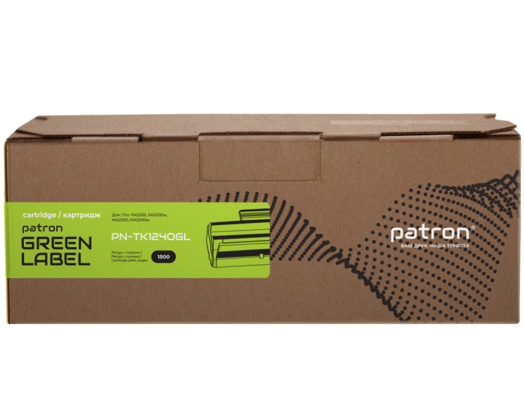 | Тонер-картридж сумісний Kyocera Mita TK-1240 Green Label Patron (PN-TK1240GL) оптимальне рішення для лазерних принтерів та БФП. Основні властивості Детальна інформація: Що таке сумісний картридж? Кожен користувач друкувальної техніки стикається з питанням купівлі нового картриджа і знаходить досить велику кількість пропозицій. Як зробити правильний вибір? Розглянемо основні варіанти: Виробники друкувальних пристроїв (т.з. OEM виробники) наполягають на використанні оригінальних картриджів. Їх основний недолік - висока вартість. Сумісні картриджі виробляються різними компаніями - сторонніми виробниками. Вони дають можливість істотно заощадити на друці, проте питання оптимального балансу між якістю друку, ціною, гарантією та ресурсом картриджа залишається вибором Покупця. Тонер-картридж сумісний Kyocera Mita TK-1240 Green Label Patron (PN-TK1240GL) гарантія Ми гарантуємо 12 місяців справної роботи картриджа та проведемо заміну продукції з виробничим дефектом. Якість друку Картриджі серії Patron Green Label виготовляються з використанням нових корпусів та повністю придатні для повторної заправки. Основна відміна серії Patron Green Label від картриджів низького цінового сегменту – якість комплектуючих, що забезпечує високу оптичну щільність друку, а також ресурс, аналогічний оригінальному картриджу. При виробництві картриджів Patron Green Label виробник дотримується загального стандарту ISO 9001:2015 і спеціальні стандарти, що використовуються в індустрії друку - ISO 19752:2017 для монохромних картриджів ISO 19798:2017 - для кольорових картриджів, а також STMC стандарт для контролю ресурсу. Захист навколишнього середовища Виробництво картриджів Patron Green Label відбувається з виконанням вимог міжнародного стандарту по захисту навколишнього середовища - ISO 14001:2015. Залишки матеріалів і комплектуючих, що використовуються для виробництва картриджів Patron Green Label, передаються на утилізацію відповідно Закону України "Про відходи". Для виробництва картонної упаковки ми використовуємо перероблені матеріали з нанесенням мінімальної кількості фарби. А конструкція коробки для картриджа дозволяє кілька разів відкривати і закривати його на "замок" для транспортування в сервісний центр. Ми закликаємо до нанесення мінімального впливу на довкілля. Тому заправляйте і відновлюйте картриджі Patron Green Label. Тонер-картридж сумісний Kyocera Mita TK-1240 Green Label Patron (PN-TK1240GL) економія на офісному друці Вартість картриджів серії Patron Green Label в середньому на 70-80% нижче оригінальних витратних матеріалів. Оптимальне співвідношення ціна-якість робить дану продукцію хорошим вибором для Клієнтів, що бажають заощадити на друці і не прогадати з якістю. Зовнішній вигляд Ми потурбувалися про те, щоб упаковка картриджа була не лише екологічною, функціональною, мала мінімально можливі фізичні розміри, але і містила усю необхідну інформацію. На зеленій етикетці знаходиться інформація про картридж, його сумісність з друкувальними пристроями, номер партії, дата виготовлення, контакти виробника, а також номер телефону безкоштовної гарячої лінії для українських споживачів. Сподіваємось, що наведена інформація дозволить Вам зробити правильний вибір. Ваш друк – наша турбота! Оптимальний варіант для користувача, що хоче заощадити;При виробництві картриджа використовується новий корпус;Гарантований ресурс;Економія 70-80% у порівнянні з оригінальними витратни
