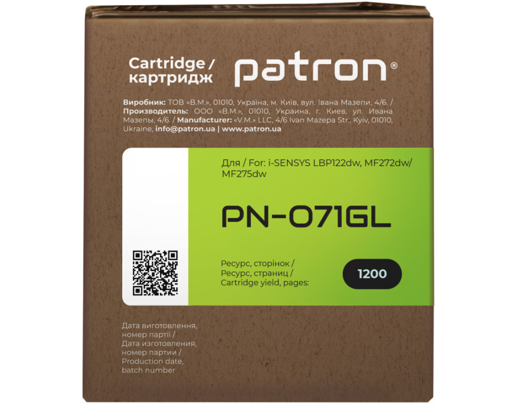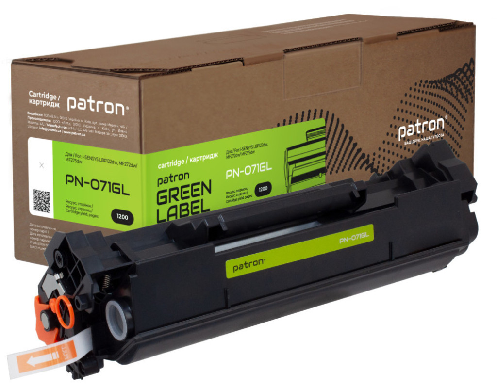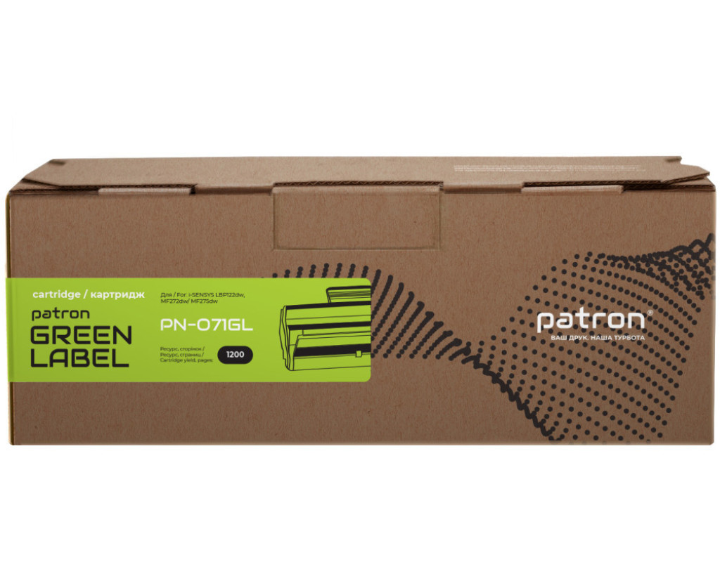 | Картридж сумісний Canon 071 Green Label Patron (PN-071GL) оптимальне рішення для лазерних принтерів та БФП. Основні властивості Детальна інформація: Що таке сумісний картридж? Кожен користувач друкувальної техніки стикається з питанням купівлі нового картриджа і знаходить досить велику кількість пропозицій. Як зробити правильний вибір? Розглянемо основні варіанти: Виробники друкувальних пристроїв (т.з. OEM виробники) наполягають на використанні оригінальних картриджів. Їх основний недолік - висока вартість. Сумісні картриджі виробляються різними компаніями - сторонніми виробниками. Вони дають можливість істотно заощадити на друці, проте питання оптимального балансу між якістю друку, ціною, гарантією та ресурсом картриджа залишається вибором Покупця. Картридж сумісний Canon 071 Green Label Patron (PN-071GL) гарантія Ми гарантуємо 12 місяців справної роботи картриджа та проведемо заміну продукції з виробничим дефектом. Якість друку Картриджі серії Patron Green Label виготовляються з використанням нових корпусів та повністю придатні для повторної заправки. Основна відміна серії Patron Green Label від картриджів низького цінового сегменту – якість комплектуючих, що забезпечує високу оптичну щільність друку, а також ресурс, аналогічний оригінальному картриджу. При виробництві картриджів Patron Green Label виробник дотримується загального стандарту ISO 9001:2015 і спеціальні стандарти, що використовуються в індустрії друку - ISO 19752:2017 для монохромних картриджів ISO 19798:2017 - для кольорових картриджів, а також STMC стандарт для контролю ресурсу. Захист навколишнього середовища Виробництво картриджів Patron Green Label відбувається з виконанням вимог міжнародного стандарту по захисту навколишнього середовища - ISO 14001:2015. Залишки матеріалів і комплектуючих, що використовуються для виробництва картриджів Patron Green Label, передаються на утилізацію відповідно Закону України "Про відходи". Для виробництва картонної упаковки ми використовуємо перероблені матеріали з нанесенням мінімальної кількості фарби. А конструкція коробки для картриджа дозволяє кілька разів відкривати і закривати його на "замок" для транспортування в сервісний центр. Ми закликаємо до нанесення мінімального впливу на довкілля. Тому заправляйте і відновлюйте картриджі Patron Green Label. Картридж сумісний Canon 071 Green Label Patron (PN-071GL) економія на офісному друці Вартість картриджів серії Patron Green Label в середньому на 70-80% нижче оригінальних витратних матеріалів. Оптимальне співвідношення ціна-якість робить дану продукцію хорошим вибором для Клієнтів, що бажають заощадити на друці і не прогадати з якістю. Зовнішній вигляд Ми потурбувалися про те, щоб упаковка картриджа була не лише екологічною, функціональною, мала мінімально можливі фізичні розміри, але і містила усю необхідну інформацію. На зеленій етикетці знаходиться інформація про картридж, його сумісність з друкувальними пристроями, номер партії, дата виготовлення, контакти виробника, а також номер телефону безкоштовної гарячої лінії для українських споживачів. Сподіваємось, що наведена інформація дозволить Вам зробити правильний вибір. Ваш друк – наша турбота! Оптимальний варіант для користувача, що хоче заощадити;При виробництві картриджа використовується новий корпус;Гарантований ресурс;Економія 70-80% у порівнянні з оригінальними витратними матеріалами;Виробник додержується ста