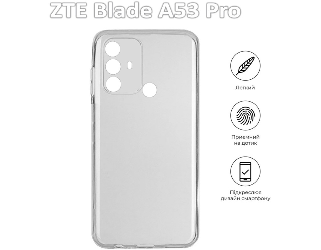 сумісність з моделями - ZTE Blade A53 Pro, Тип чохла для телефону - накладка, Призначення - модельний, Колір - прозорий