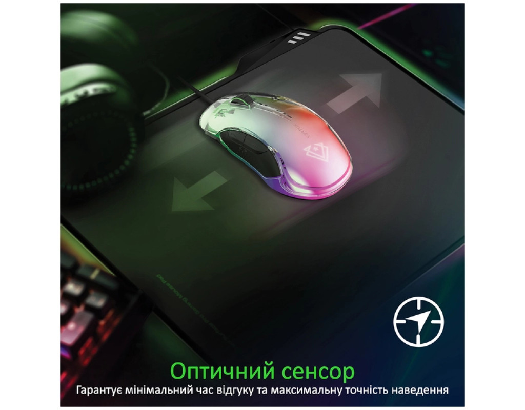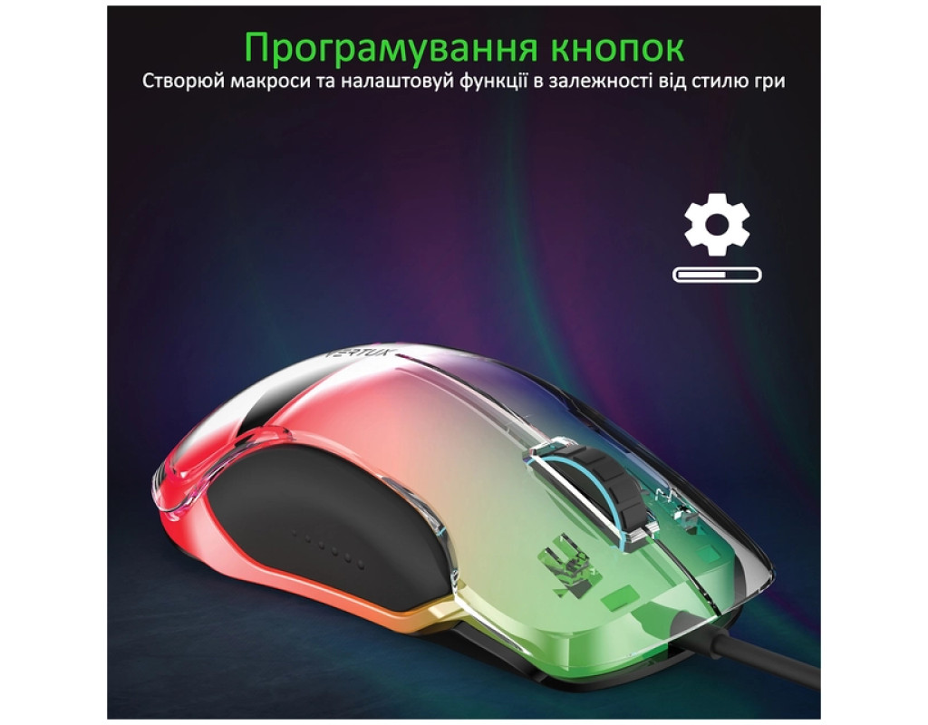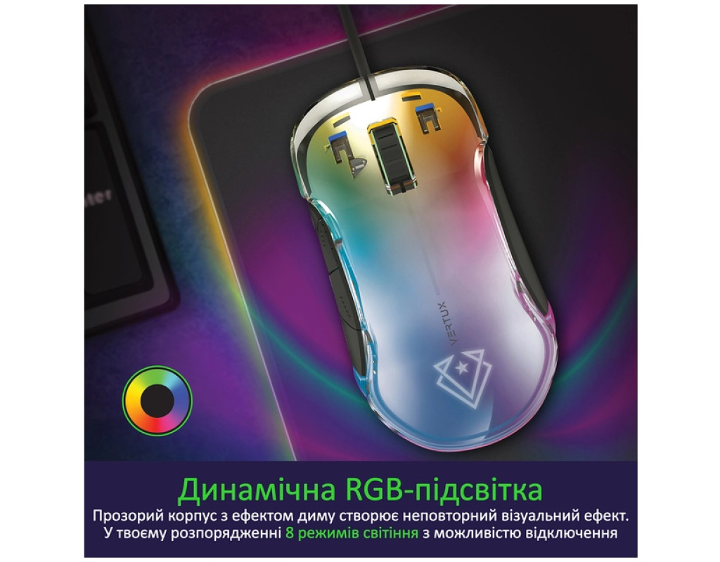 | Мишка Vertux Phoenix USB Black (phoenix.black) — це справжнє втілення високотехнологічного дизайну та потужної функціональності, створене спеціально для геймерів, які цінують надійність та стиль. Її оригінальний дизайн з прозорим корпусом та димною підсвіткою не тільки вразить своєю візуальною привабливістю, але й підкорить серця завзятих геймерів своєю ефективністю під час гри. Ця геймерська мишка з дротовим підключенням через USB-інтерфейс забезпечує стабільне з'єднання без затримок, що є критично важливим для насичених ігрових сесій. Оптичний сенсор нового покоління гарантує мінімальний час відгуку та бездоганну точність наведення. Регульована роздільна здатність до феноменальних 12000 dpi забезпечує можливість перемикання між семи рівнями чутливості (800/1600/2400/3200/4000/6000/12000 dpi) лише одним натисканням. Основою зручності Vertux Phoenix є її ергономічний корпус, виготовлений з приємного на дотик софт-тач пластику. Він ідеально повторює вигин долоні, що забезпечує надійне схоплення та легке керування навіть під час тривалих ігрових сесій. Програмовані кнопки, яких у мишці налічується аж вісім, дають можливість налаштовувати макроси та перепризначати функції відповідно до вашого стилю гри. При цьому динамічна RGB-підсвітка з ефектом диму додає атмосферності та ставок на перемогу. Перемикайте між вісьмома режимами світіння, або вимкніть їх за потреби, щоб створити свою ігрову атмосферу. Великі глайди допоможуть мишці легко ковзати на будь-якій поверхні, забезпечуючи плавний та легкий рух. Нейлоновий кабель розміром 1.8 метра оснащений протекторами в місцях з'єднання, що робить його стійким до ламань і поломок. Він без зусиль дотягнеться до задньої панелі вашого ПК. Завдяки технології Plug & Play, Vertux Phoenix готова до використання на будь-якій операційній системі — Windows, MacOS або Linux. Вам потрібно лише вставити її в USB-A порт. У будь-якій грі, чи то стратегічна бійня у World of Tanks або динамічна перестрілка, Vertux Phoenix стане вашим надійним союзником. Її легка вага у 115 г та продумані розміри (120 х 65 х 38 мм) роблять її ідеальним вибором для швидких та точних дій. Відчуйте переваги, які надає ця мишка і рушайте до перемоги! |