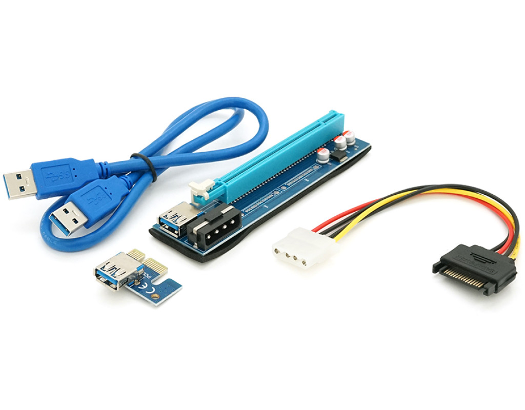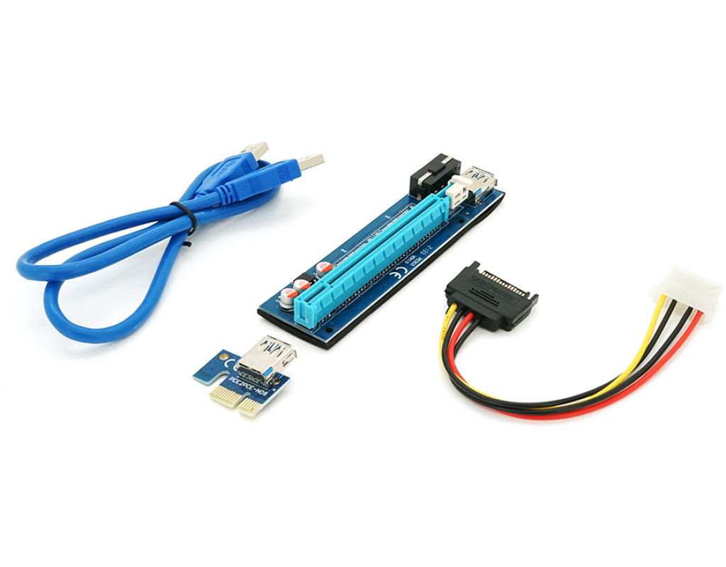 | • Адаптер-плата для підключення відеокарти PCIE16x • Адаптер для підключення до материнської плати PCIE1x • З`єднувальний кабель USB 3.0 AM-AM довжиною 60 см • Кабель додаткового живлення 4 Pin — SATA |
