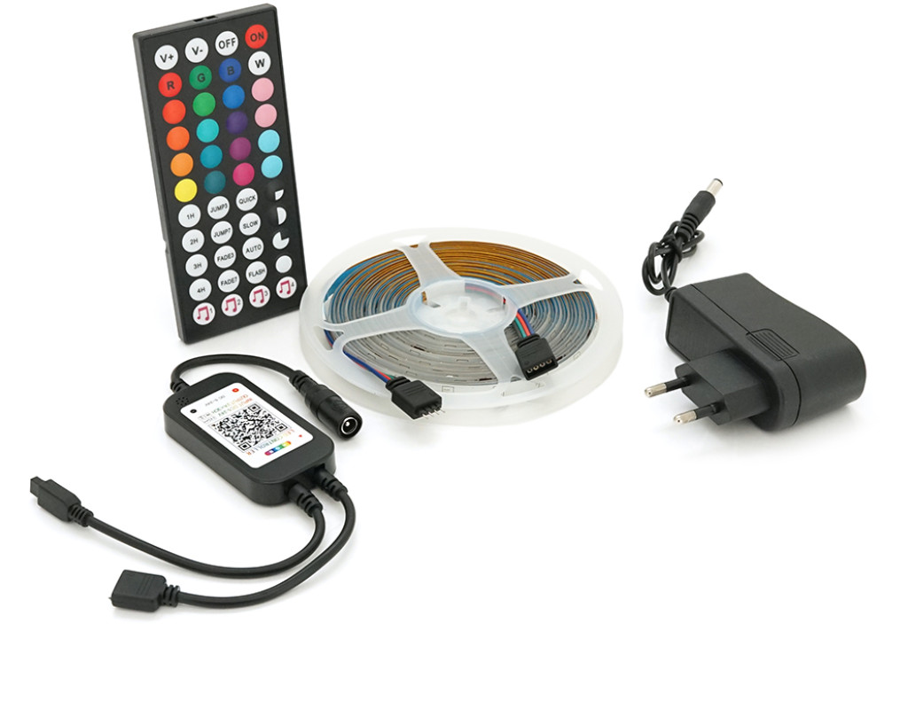 | Комплект музичної світлодіодної стрічки 3528 RGB 5 метрів, 54Led, пульт, блок живлення, bluetooth, ip65 |
