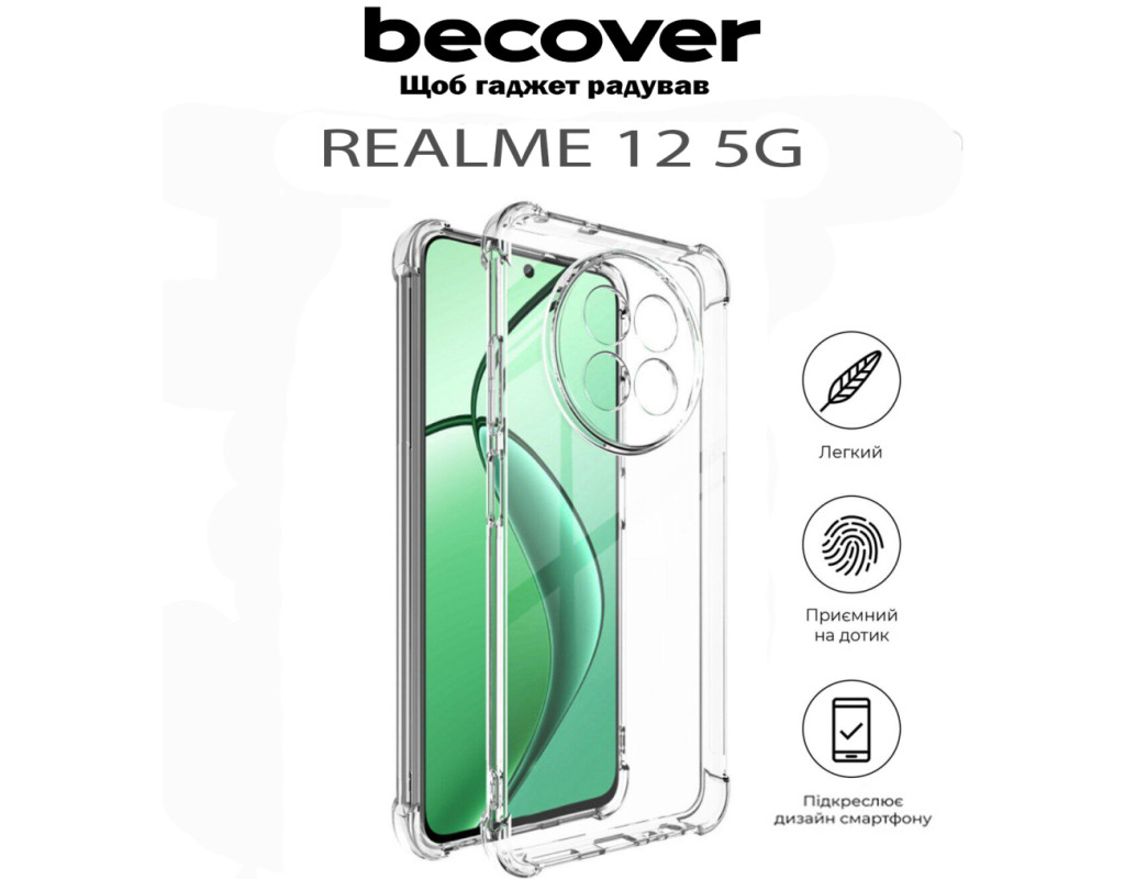 сумісність з моделями - Realme 12 5G, Тип чохла для телефону - накладка, Призначення - модельний, Колір - прозорий