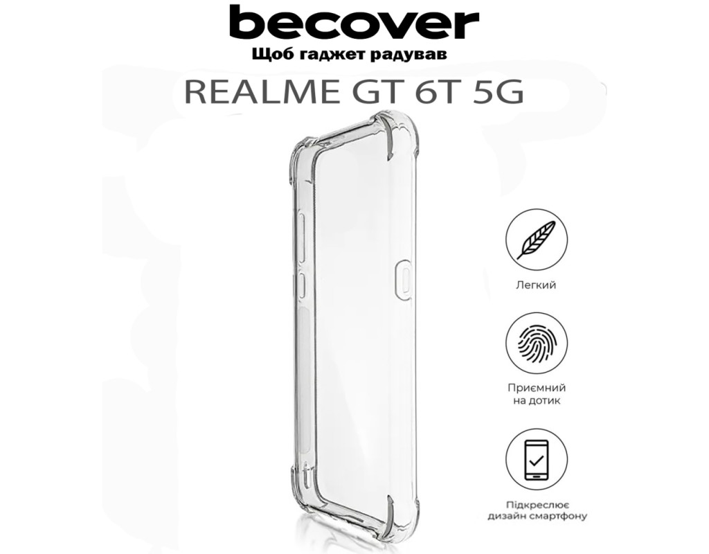 сумісність з моделями - Realme GT 6T 5G, Тип чохла для телефону - накладка, Призначення - модельний, Колір - прозорий