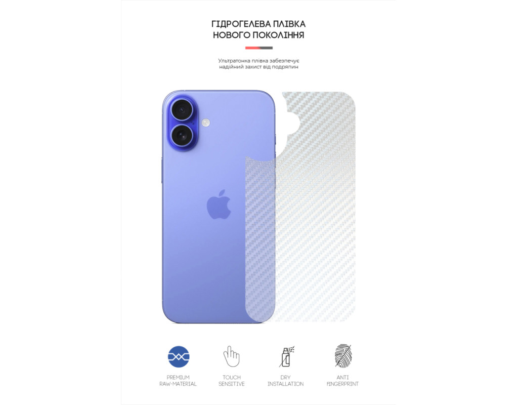 Призначення - на задню панель, Вид покриття - захисний, гідрогелева, Сумісність з моделями - Apple iPhone 16, Кількість в упаковці - 1 шт