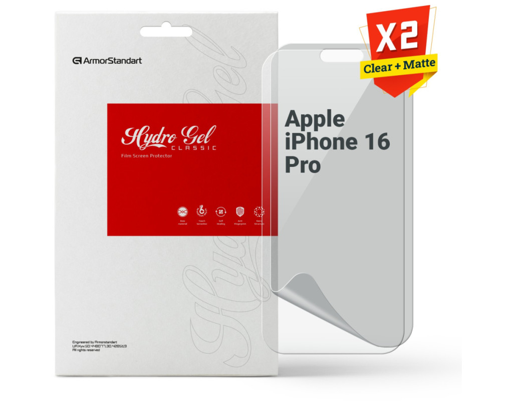 Призначення - для телефону, Вид покриття - глянсове, матове, захисний, гідрогелева, Сумісність з моделями - Apple iPhone 16 Pro, Кількість в упаковці - 2 шт