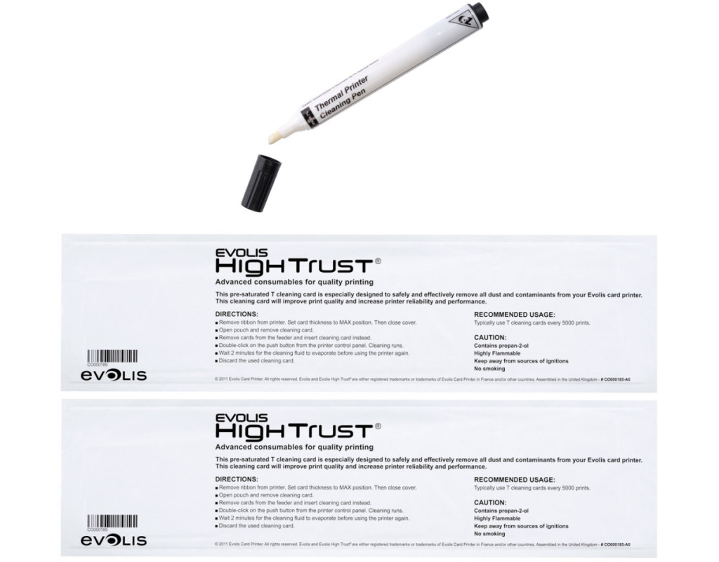 Друк на пластикових картках потребує звичайного очищення принтера, оскільки картки можуть мати висоту статичність зарядів, притягуючи бруд та пил. Комплект для очищення ACL008 (дві вологі картки типу 'T', один олівець для очищення) - комплект для очищення транспортного ролика та друкарської головки. |