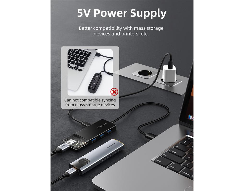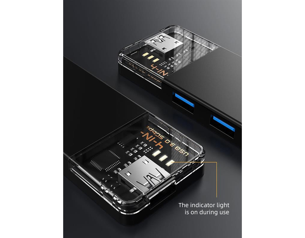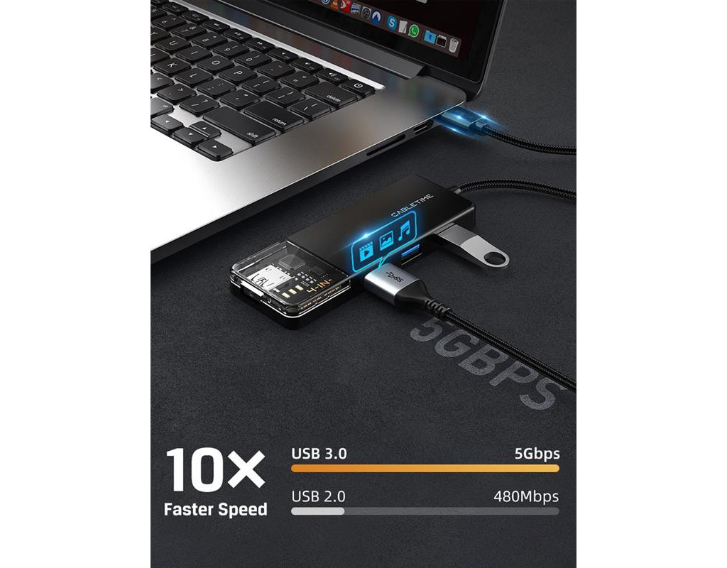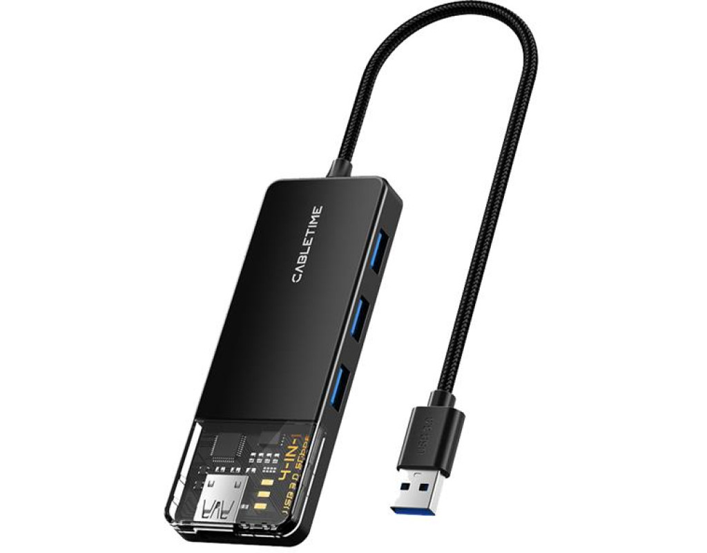 | USB-хаб Cabletime USB A - 4 Port USB 3.0, 5Gbps, 0.15 cm (CB01B) забезпечує максимальну швидкість передачі даних до 5 Гбіт/с, дозволяючи підключати кілька USB-пристроїв, таких як клавіатури, миші або портативні пристрої зберігання даних.