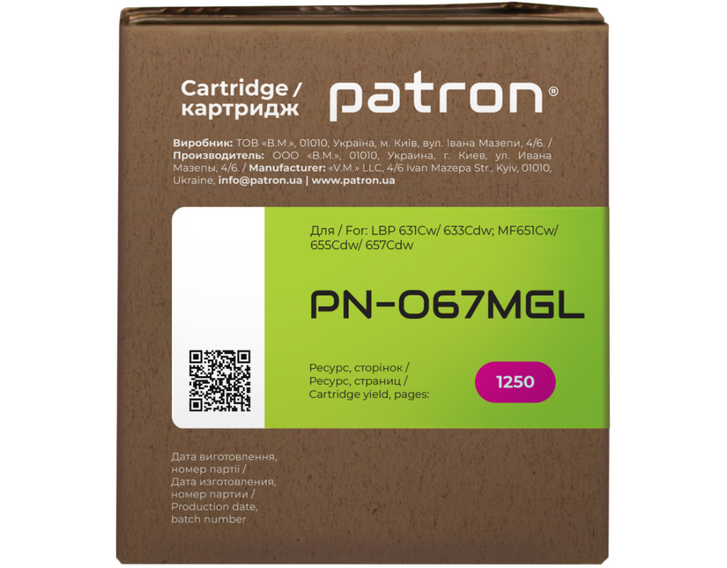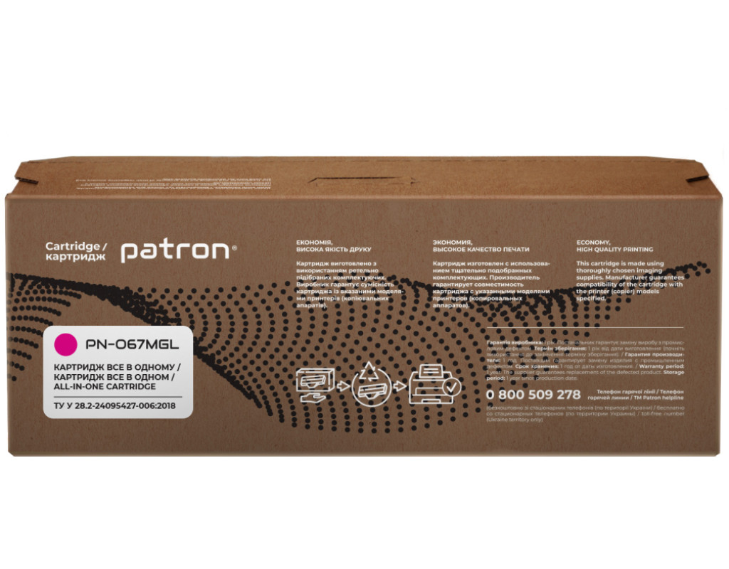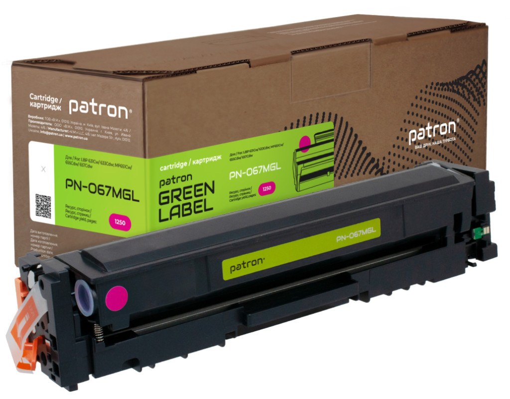 Картридж сумісний Canon 067 пурпуровий Green Label Patron (PN-067MGL) оптимальне рішення для лазерних принтерів та БФП. Основні властивості Детальна інформація: Що таке сумісний картридж? Кожен користувач друкувальної техніки стикається з питанням купівлі нового картриджа і знаходить досить велику кількість пропозицій. Як зробити правильний вибір? Розглянемо основні варіанти: Виробники друкувальних пристроїв (т.з. OEM виробники) наполягають на використанні оригінальних картриджів. Їх основний недолік - висока вартість. Сумісні картриджі виробляються різними компаніями - сторонніми виробниками. Вони дають можливість істотно заощадити на друці, проте питання оптимального балансу між якістю друку, ціною, гарантією та ресурсом картриджа залишається вибором Покупця. Картридж сумісний Canon 067 пурпуровий Green Label Patron (PN-067MGL) гарантія Ми гарантуємо 12 місяців справної роботи картриджа та проведемо заміну продукції з виробничим дефектом. Якість друку Картриджі серії Patron Green Label виготовляються з використанням нових корпусів та повністю придатні для повторної заправки. Основна відміна серії Patron Green Label від картриджів низького цінового сегменту – якість комплектуючих, що забезпечує високу оптичну щільність друку, а також ресурс, аналогічний оригінальному картриджу. При виробництві картриджів Patron Green Label виробник дотримується загального стандарту ISO 9001:2015 і спеціальні стандарти, що використовуються в індустрії друку - ISO 19752:2017 для монохромних картриджів ISO 19798:2017 - для кольорових картриджів, а також STMC стандарт для контролю ресурсу. Захист навколишнього середовища Виробництво картриджів Patron Green Label відбувається з виконанням вимог міжнародного стандарту по захисту навколишнього середовища - ISO 14001:2015. Залишки матеріалів і комплектуючих, що використовуються для виробництва картриджів Patron Green Label, передаються на утилізацію відповідно Закону України "Про відходи". Для виробництва картонної упаковки ми використовуємо перероблені матеріали з нанесенням мінімальної кількості фарби. А конструкція коробки для картриджа дозволяє кілька разів відкривати і закривати його на "замок" для транспортування в сервісний центр. Ми закликаємо до нанесення мінімального впливу на довкілля. Тому заправляйте і відновлюйте картриджі Patron Green Label. Картридж сумісний Canon 067 пурпуровий Green Label Patron (PN-067MGL) економія на офісному друці Вартість картриджів серії Patron Green Label в середньому на 70-80% нижче оригінальних витратних матеріалів. |