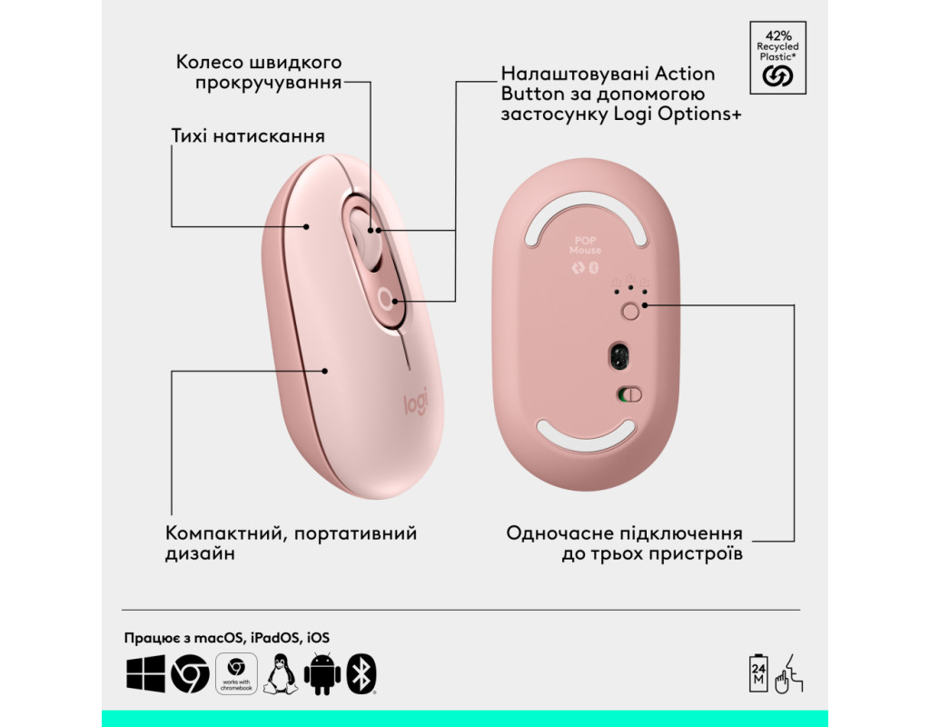 | Індивідуальність і стиль в кожній деталі Logitech POP Mouse With Emoji Bluetooth Rose (910-007413) — це не просто миша, а ваш особистий почерк у світі технологій. Вона розроблена з неперевершеним акцентом на оригінальний дизайн, ідеально підходить для тих, хто бажає виділити свій стиль, навіть під час роботи. Завдяки можливості налаштування з використанням веселих емодзі, ви можете втілити свою креативність у кожному робочому моменті. Додайте яскравостей вашій повсякденності з цією портативною мишею, що вдало поєднує в собі стиль і функціональність. Технологія комфортного користування Оснащена технологією SilentTouch, POP Mouse забезпечує тихі кліки, перетворюючи робочий процес на спокійну і зосереджену діяльність. Це ідеальний вибір для людей, які цінують тишу і спокій. Миша забезпечує бездротове підключення через Bluetooth, що надає свободу рухів і комфорт у будь-якому місці, де б ви не знаходилися. Універсальність і довговічність Ця миша, з оптичним датчиком з роздільною здатністю до 4000 dpi, гарантує високу точність та плавність переміщень курсора, що робить її ідеальною для роботи зі складними графічними програмами або детальною обробкою зображень. Вона підходить як для правші, так і для лівші, забезпечуючи зручність для будь-якого користувача. Інноваційний підхід до живлення Живлення миші здійснюється від одного батарейного елемента типу AA, забезпечуючи до 24 місяців безперервної роботи, що звільняє вас від турбот про часту зміну батарей. Це справді практичне рішення для активних користувачів, які хочуть забути про зайві технічні турботи. Компактні розміри для найкращого комфорту Завдяки компактним розмірам (104.8 x 35.2 x 59.4 мм) та легкій вазі (лише 82 г), Logitech POP Mouse легко транспортується та відмінно підходить для використання з ноутбуками. Її елегантний прозорий колір додає витонченості і вишуканості будь-якому робочому місцю. Ця миша стане незамінним гаджетом у вашому арсеналі, поєднуючи в собі якість, унікальні функції та бездоганний дизайн, щоб зробити ваш робочий процес максимально приємним та ефективним. Обираючи Logitech POP Mouse, ви отримаєте не просто засіб введення, а справжнього помічника у всіх ваших цифрових задачах. |