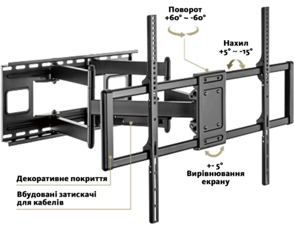 | Кронштейн ITech PTRB-95 - це надзвичайно надійне рішення для встановлення великогабаритних телевізорів, забезпечуючи надійність і зручність у використанні. Здатний витримати вагу до 120 кг, цей поворотно-похилий кронштейн призначено для телевізорів із діагоналлю від 60 до 100 дюймів і є ідеальним вибором для тих, хто шукає бездоганну сумісність з популярними моделями на ринку. Основною перевагою ITech PTRB-95 є його три ступені свободи, які дозволяють легко налаштовувати кут перегляду відповідно до ваших потреб. Завдяки куту повороту від -60° до +60° ви можете повернути телевізор у будь-якому напрямку, мінімізуючи відблиски та покращуючи якість перегляду. Крім того, з можливістю нахилу екрану від 5° до -15°, ви можете регулювати висоту телевізора для досягнення оптимального кута зору. Кронштейн оснащено продуманою системою кабель-менеджменту, що дозволяє приховувати дроти та надає інтер'єру чистий і стильний вигляд. Це унікальне рішення зберігає естетику вашого приміщення та додає зручності у використанні пристрою. Буцім VESA-сумісність ITech PTRB-95 включає стандарти 200x200, 300x200, 300x300, 400x200, 400x300, 400x400, 600x400, 800x400, 800x600, 900x600, що забезпечує максимальну гнучкість під час встановлення. Завдяки цій широкій підтримці, ви з легкістю та швидкістю зможете встановити телевізор на стіну. Комплектація кронштейна містить все необхідне для монтажу: сам кронштейн, інструкцію та монтажний комплект, що робить процес встановлення простим і без зайвих клопотів. Конструкція кронштейна спроектована для надійного кріплення на суцільній стіні чи з подвійними стержнями (406 мм/450 мм/600 мм), гарантуючи стійкість навіть під максимальним навантаженням. Виготовлений із міцної сталі високої якості, ITech PTRB-95 обіцяє довговічність та надійність, які задовольнять найвибагливіші вимоги користувачів. Це рішення спеціально створено для тих, хто цінує високу якість та адаптивність у поєднанні із стильним дизайном. Виберіть ITech PTRB-95 для свого телевізора та насолоджуйтеся комфортом бездоганного перегляду. |
