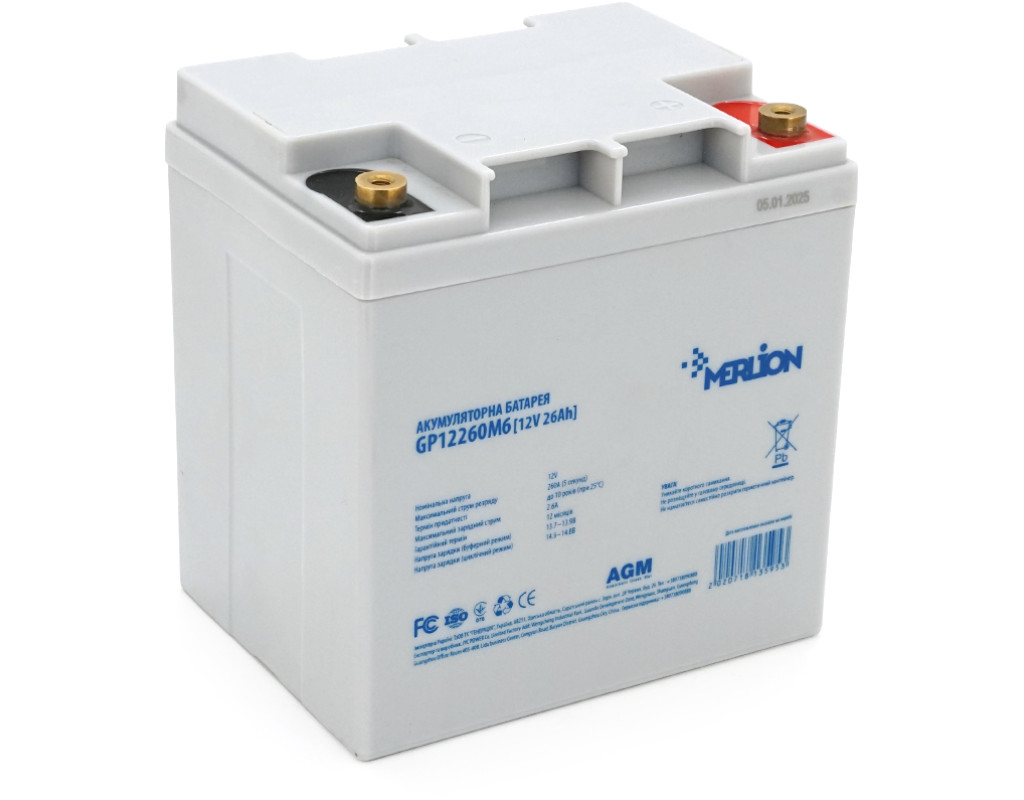 | Акумуляторна батарея MERLION AGM GP12260M5 – надійний електричний компаньйон для ваших пристроїв. Має герметичний міцний корпус, який прослужить довго і щасливо. Застосування: • джерела безперебійного живлення • у сонячних та вітрових установках; • у телекомунікаціях та промообладнанні; • в електростанціях; • у системах резервного освітлення • у складі систем відеоспостереження, сигналізації, контролю доступу • у мережах пожежно-охоронних автоматизованих комплексів Характеристики: • Кількість елементів: 6 • Напруга: 12 В • Номінальна ємність: 26 A / год. при 20 годинному розряді до 1,75 В на елемент при 25 °C • Внутрішній опір 12 мОм • Тип клем: M5 • Максимальний струм розряду: 260 А (5 секунд) • Максимальний зарядний струм: 7,8 A • Напруга заряду в буферному режимі: 13,7 В ~ 13,9 В при 25 ° С • Температурна компенсація: -3 мВ / °C / елемент • Напруга заряду в циклічному режимі: 14,6 В ~ 14,8 В при 25 ° С • Температурна компенсація: -4 мВ / °C / елемент • Діапазон робочих температур: - розряд: 10°C ~ 60°C - заряд: 10 ° C ~ 50 ° C - зберігання: 10°C ~ 60°C • Нормальний діапазон робочих температур: 25±5°C • Матеріал корпусу: пластик • Саморозряд: - може зберігатися до 6 місяців при температурі 25°C, а потім рекомендується підзаряджання. Щомісячний коефіцієнт саморозряду становить менше 3% при 25°C. • Розміри: • Розміри (ДхШхВ): 125x165x175 мм - Висота з клемами: 125 мм • Маса: 7,400 кг (Допуск ± 5,0%) |