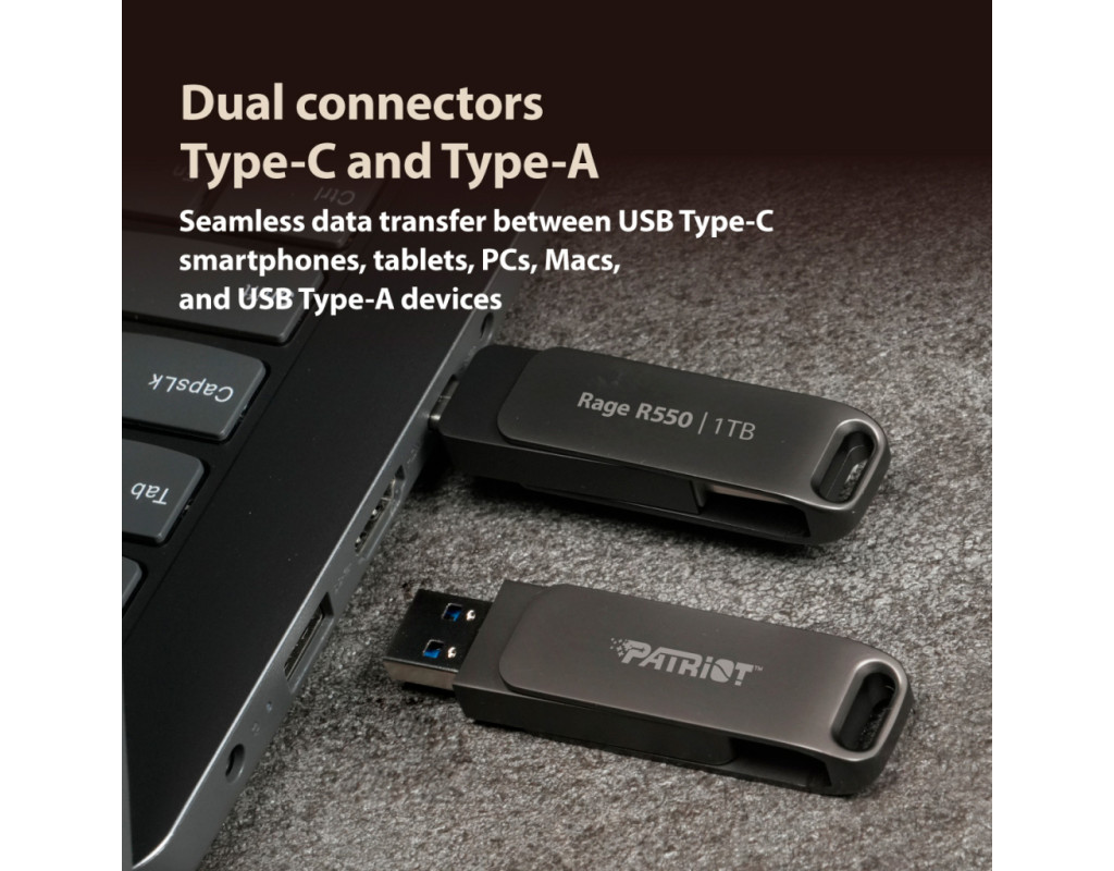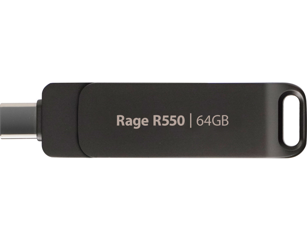 Флеш-накопичувач Rage R550 USB 3.2 це високошвидкісний USB-накопичувач з подвійним інтерфейсом USB Type-C і USB A. USB Type-C робить його універсальним роз'ємом, який можна використовувати для різних цілей, зокрема для передачі даних, відео та аудіо на більш високих швидкостях, ніж звичайний USB. Зі швидкістю читання до 100 МБ/с завантаження та передача файлів відбуваються швидше та ефективніше, ніж будь-коли. Щоб зберегти файли в безпеці, роз'єми USB захищено, а сам накопичувач оснащено отвором для ключів, який можна повісити на кільце для ключів, зберігаючи його в безпеці та портативності. Rage 550 USB - це флеш-накопичувач подвійного призначення, який дозволяє легко переносити файли між смартфонами, планшетами та комп'ютерами з інтерфейсом USB Type-C, а також Mac і комп'ютерами з інтерфейсом USB Type-A. Він також дозволяє переносити всі записи з iPhone 15, сумісних з iPhone і iPad, на USB-пристрій, забезпечуючи максимальний обсяг пам'яті вашого пристрою. Особливості: