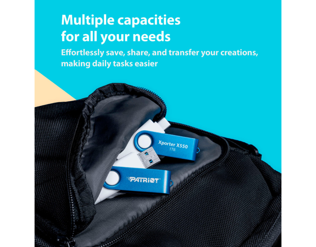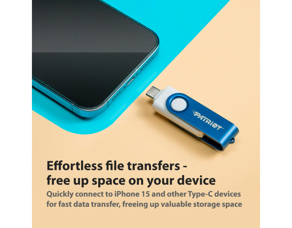 Xporter X550 USB 3.2 Gen 1 - це новий USB, створений, щоб максимально полегшити ваше робоче та творче життя! Завдяки подвійному інтерфейсу USB Type-C і USB A всі відео, аудіо та дані можна передавати на більш високій швидкості, що дозволяє легко зберігати, обмінюватися і переміщати що завгодно - від бізнес-файлів до контенту для створення. Цей флеш-накопичувач подвійного призначення дозволяє передавати дані між смартфонами та планшетами з інтерфейсом USB Type-C, а також комп'ютерами Mac і всіма комп'ютерами з інтерфейсом USB Type-A. Крім того, всі записи з iPhone 15, сумісних з iPhone і iPad, можна переносити безпосередньо на Xporter X550, звільняючи додатковий простір на декількох типах пристроїв і дозволяючи продовжувати роботу над новими проектами, не вичерпуючи обсяг пам'яті. Особливості: